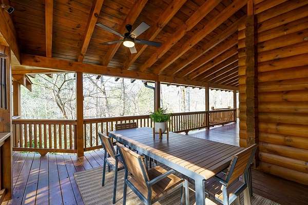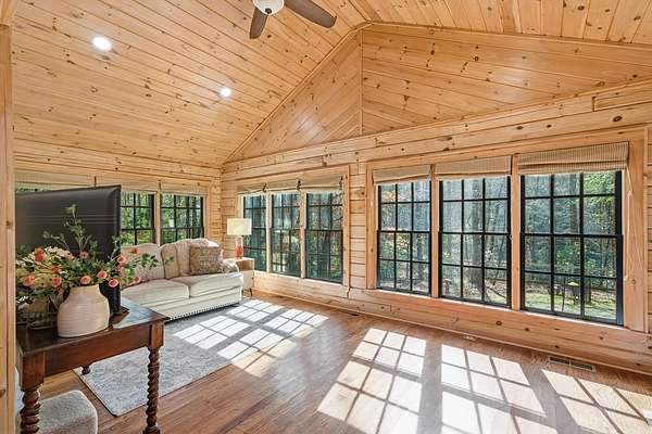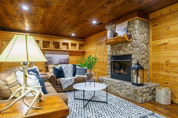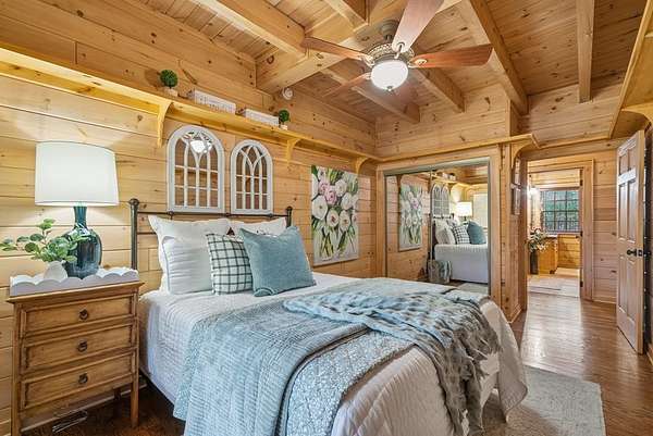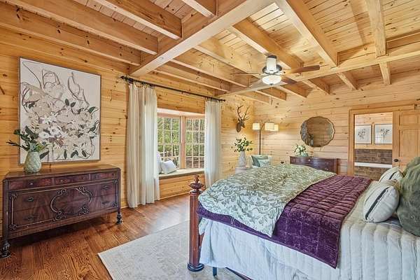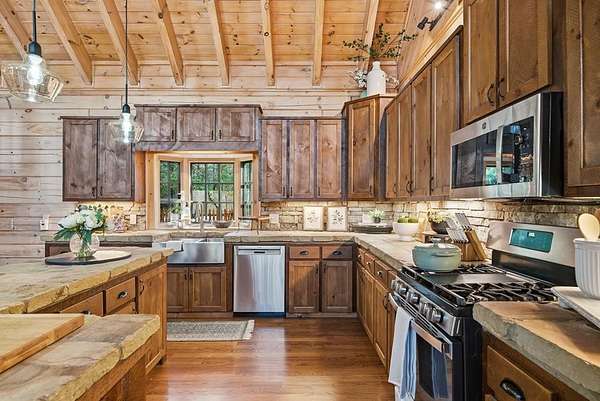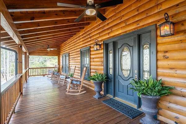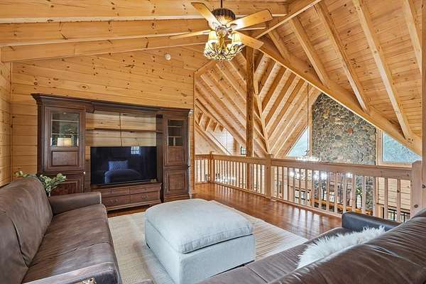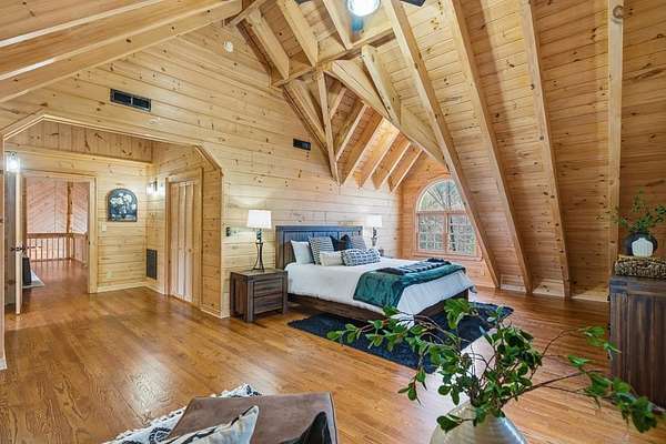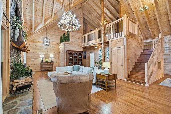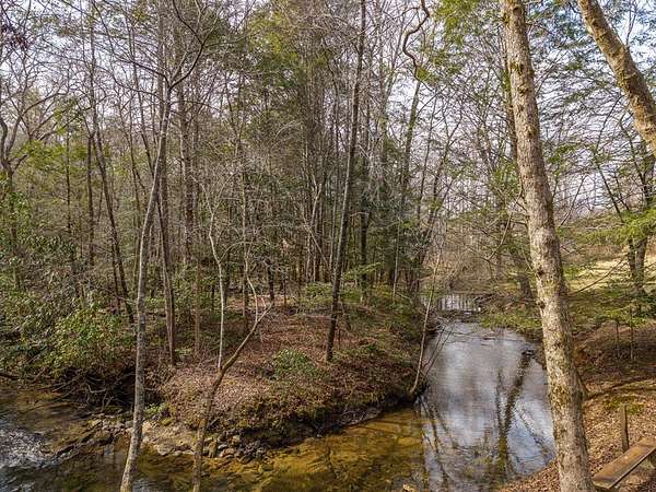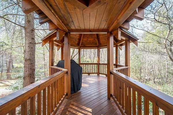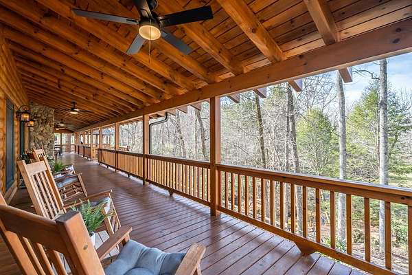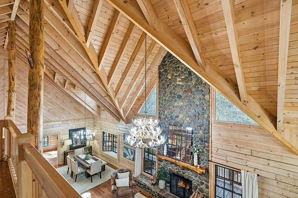 The sights and sounds of Patterson Creek as it winds through this nearly 5-acre, very private property are the star of this meticulously cared-for cabin located not far from downtown Blue Ridge. Along with a beautiful rushing creek lined with mountain laurels, the lot offers a blend of wooded acres, a trail, large rocks, and a pasture, which could be fenced for livestock, serve as a garden, or host an ADU for family or guests. From the full-length covered deck with its own gazebo to the creekside fire pit, your own mountain paradise is waiting for you. The fenced-in yard keeps your pets safe while their muddy paws are refreshed in the stainless steel dog-washing station with hot and cold water inside the garage. Beneath the deck is shelter for your RV with power mounted nearby. Encircled by a driveway, this mountain retreat offers ramp access for easy entry, while inside, navigating between the lower, main, and upper levels is a breeze with your own elevator. Once inside, you'll be immediately drawn to the timber-framed cathedral ceiling, two floor-to-ceiling exposed natural timber support posts, the 2-story, stone-clad wood-burning fireplace that has a kettle hook and drop floor area for easy cleaning, warm wood finishes, and all of the light that fills the main living area from the clerestory windows. Newer appliances in the kitchen will inspire even the fussiest cook who appreciates all of the modern conveniences. The main floor hosts two bedrooms, one of which could serve as the primary, while the upstairs offers another larger primary suite right off the elevator. The lower level provides additional gathering space with a cozy den and gas fireplace, a fourth bedroom, a full bath, a bunk bed area, and access to the 3-car garage. Experience the privacy of this gated home and the comfort offered by 2 water heaters, 2 HVAC systems (1 purchased 3/25), and excellent high-speed internet. Offered mostly furnished minus personal and staging items. Come see this one!!