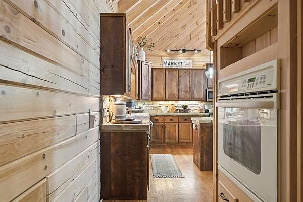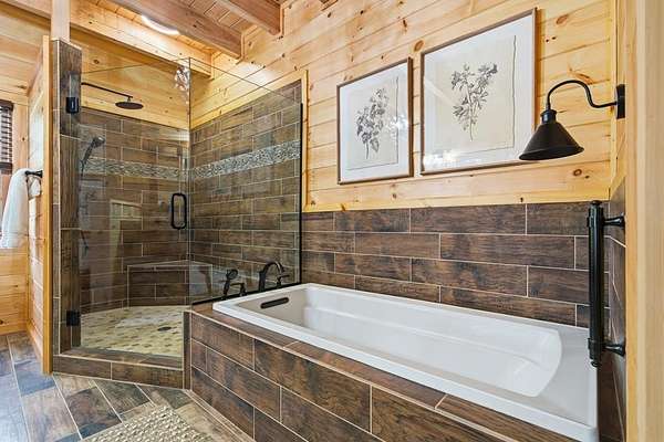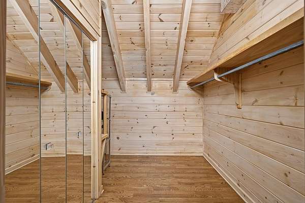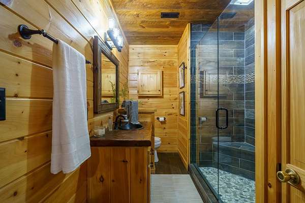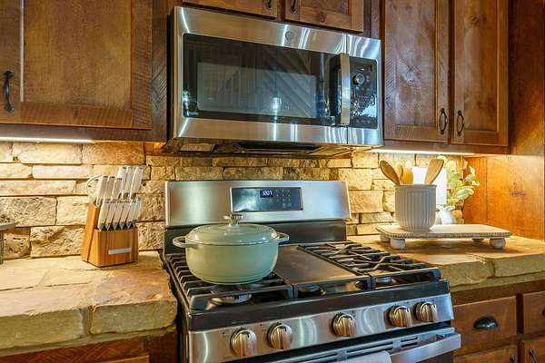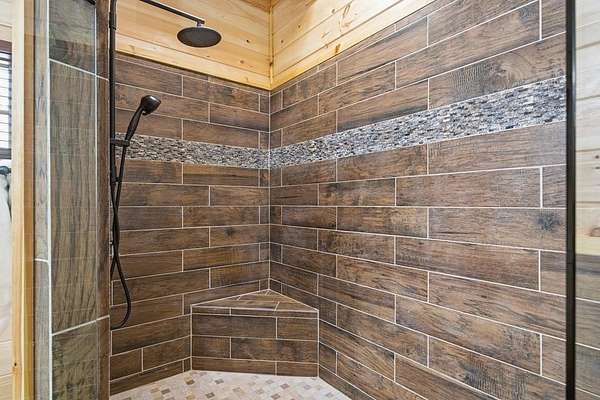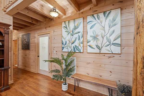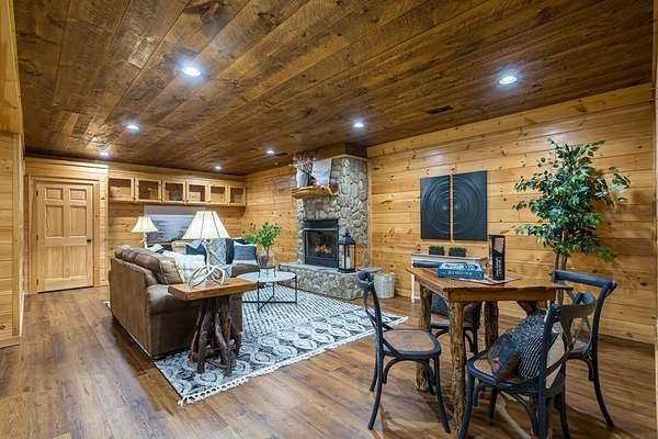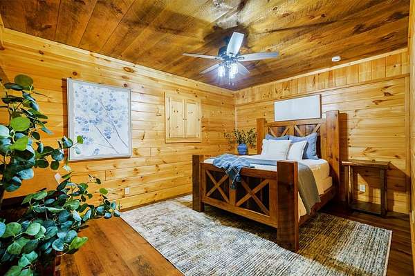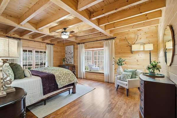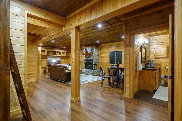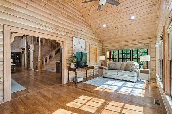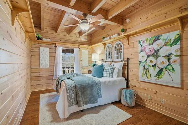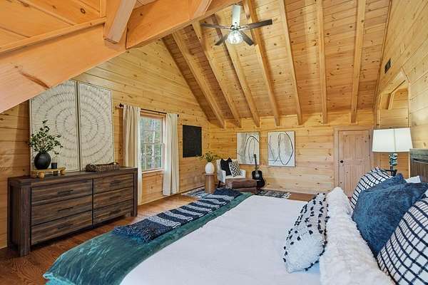 The sights and sounds of Patterson Creek as it winds through this nearly 5-acre, very private property are the star of this meticulously cared-for cabin located not far from downtown Blue Ridge. Along with a beautiful rushing creek lined with mountain laurels, the lot offers a blend of wooded acres, a trail, large rocks, and a pasture, which could be fenced for livestock, serve as a garden, or host an ADU for family or guests. From the full-length covered deck with its own gazebo to the creekside fire pit, your own mountain paradise is waiting for you. The fenced-in yard keeps your pets safe while their muddy paws are refreshed in the stainless steel dog-washing station with hot and cold water inside the garage. Beneath the deck is shelter for your RV with power mounted nearby. Encircled by a driveway, this mountain retreat offers ramp access for easy entry, while inside, navigating between the lower, main, and upper levels is a breeze with your own elevator. Once inside, you'll be immediately drawn to the timber-framed cathedral ceiling, two floor-to-ceiling exposed natural timber support posts, the 2-story, stone-clad wood-burning fireplace that has a kettle hook and drop floor area for easy cleaning, warm wood finishes, and all of the light that fills the main living area from the clerestory windows. Newer appliances in the kitchen will inspire even the fussiest cook who appreciates all of the modern conveniences. The main floor hosts two bedrooms, one of which could serve as the primary, while the upstairs offers another larger primary suite right off the elevator. The lower level provides additional gathering space with a cozy den and gas fireplace, a fourth bedroom, a full bath, a bunk bed area, and access to the 3-car garage. Experience the privacy of this gated home and the comfort offered by 2 water heaters, 2 HVAC systems (1 purchased 3/25), and excellent high-speed internet. Offered mostly furnished minus personal and staging items. Come see this one!!