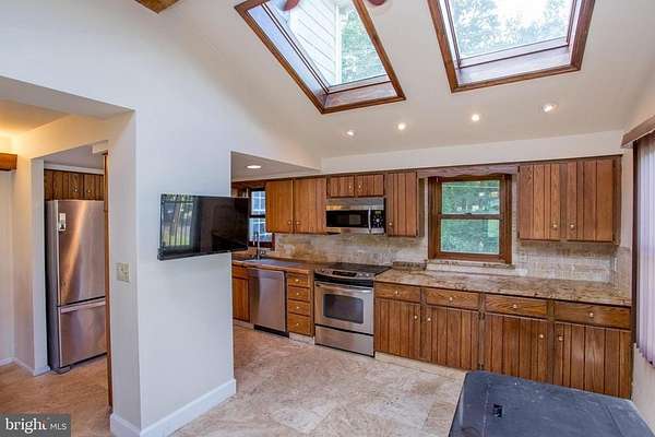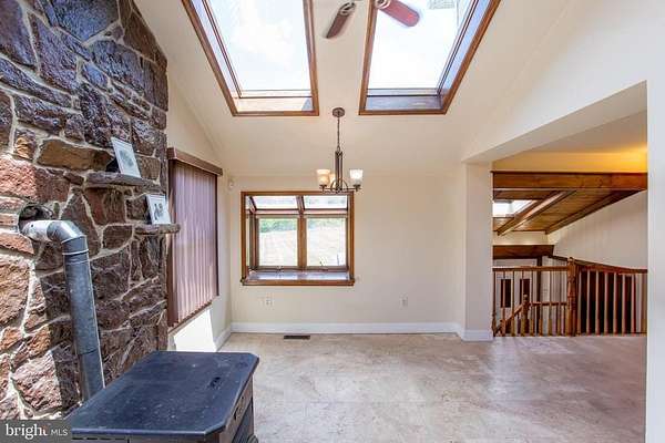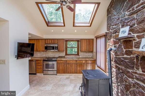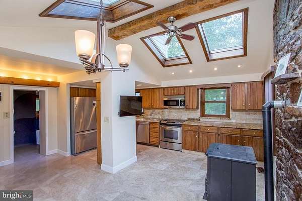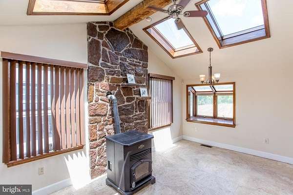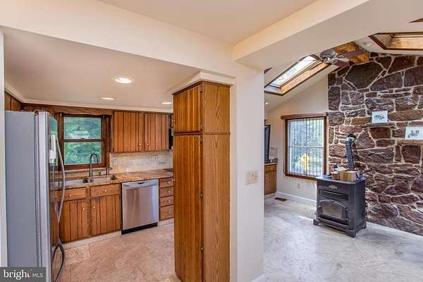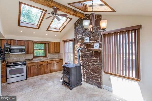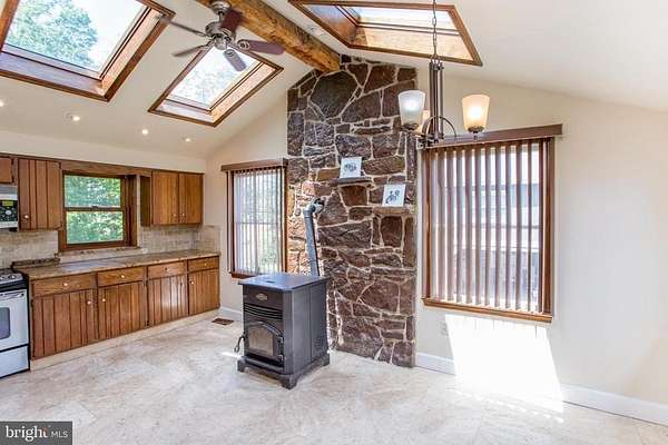 - Built-Ins, Eat-In Kitchen, Exposed Beams, Family Room Off Kitchen, Pellet Stove, Skylight(s), Traditional Floor Plan