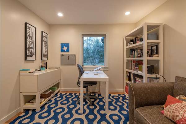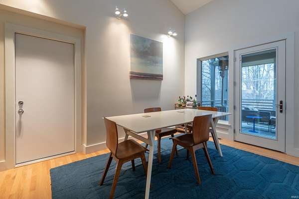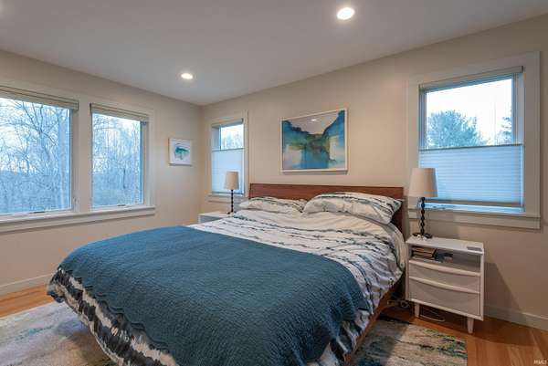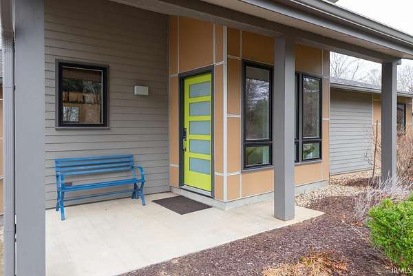 Spectacular design is combined with incredible acreage in this custom home by Loren Wood Builders and created by the architecture firm of Springpoint Architects. This tasteful home with heirloom surfaces has breathtaking views of the 1.6 acre site on Bloomington's Eastside. Attractive angles are enhanced by beautiful custom hardwood flooring and a modern kitchen with sleek design and custom cabinets by Stoll Cabinetry. Quartz countertops and recent appliances make care and preparation a breeze. Enjoy a beautiful dinner on the screened patio that overlooks the green space. This vaulted home has magnificent natural light and an intuitive flow to the studies and bedrooms with generous storage. The office features French doors and could also double as a guest room. The primary bath features a ceramic custom walk-in shower and custom cabinetry. The lower level features a Brown County stone fireplace and media center with an additional guest bedroom and full bath. There is a large laundry area with additional storage plus an unfinished storage room ideal for off-season items. The walkout lower level is filled with natural light and has a lovely door to an outside patio. This home is conveniently located near Indiana University and College Mall and has the perfect combination of town and country.