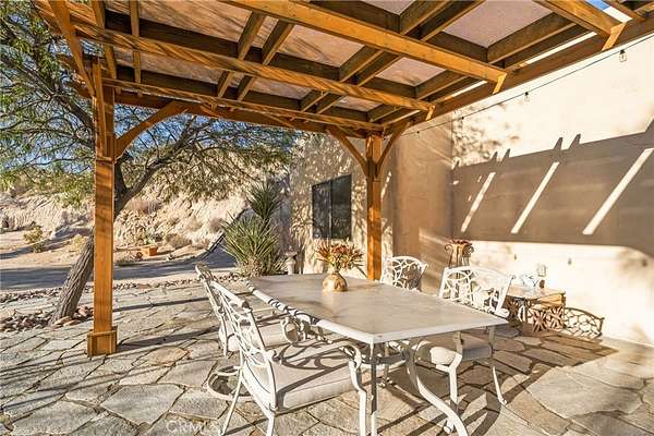 Multiple outdoor living spaces invite both gathering and quiet retreat. Enjoy evenings under the pergola, conversations around the fire pit, and peaceful walks along the natural path leading to a large shed at the back of the property - ideal for creative pursuits. Expansive flat areas offer flexibility for future enhancements, while established yuccas, Joshua trees, mesquite, junipers, and other native plants create a lush yet low-maintenance desert setting.
