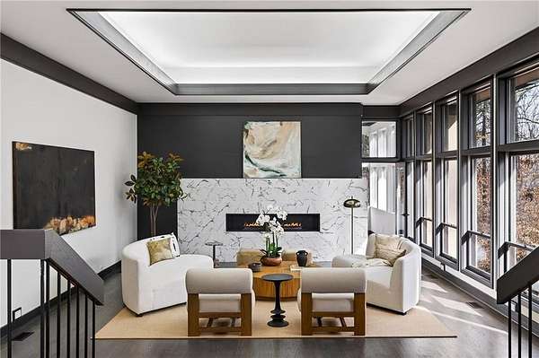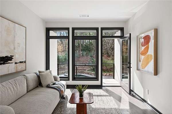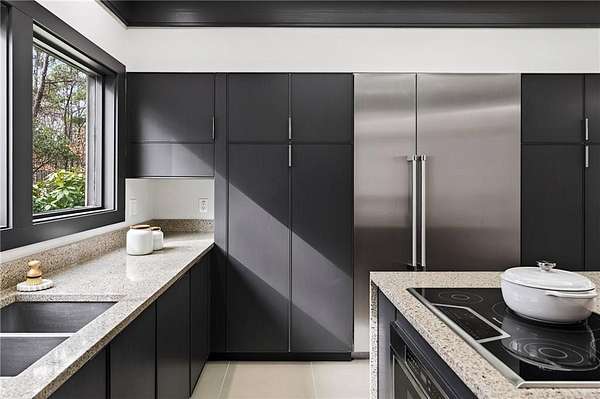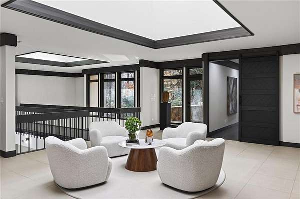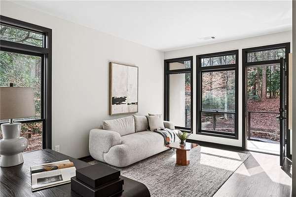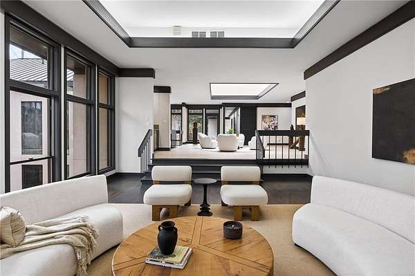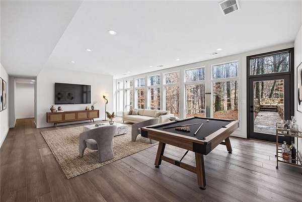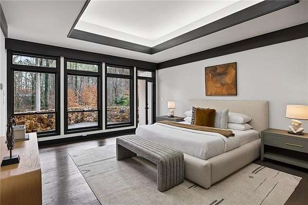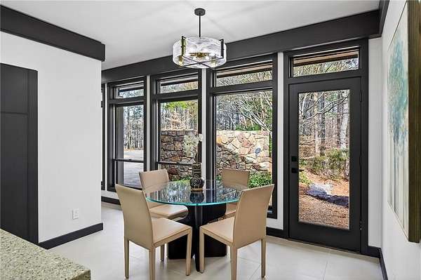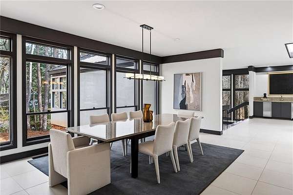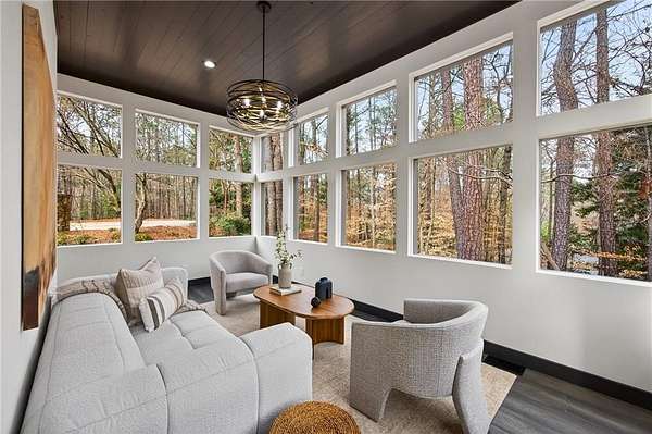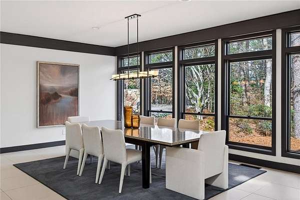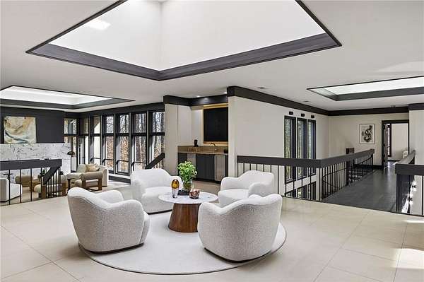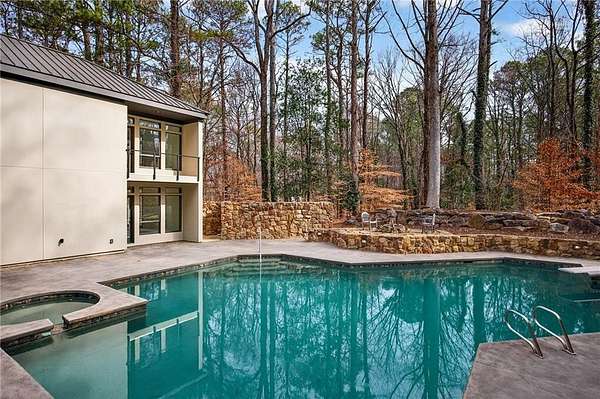 A masterfully reimagined Mid-Century Modern residence, discreetly set within the coveted enclave of Winterthur in Sandy Springs. Privately nestled on an extraordinary 2.6-acre wooded lot, this architecturally significant home offers rare seclusion while celebrating its natural surroundings through thoughtful design and abundant light. The open-concept floor plan unfolds across expansive living spaces defined by large-format tile and rich hardwood flooring, oversized picture windows, and a dramatic central atrium skylight that drenches the interiors in natural light. The kitchen is a study in modern restraint, featuring sleek inset flat-paneled cabinetry, waterfall stone countertops, and a professional-grade stainless steel appliance suite-both sculptural and highly functional. Designed for effortless entertaining, the home centers around an open-concept cocktail lounge with adjoining wet bar, ice maker, and refrigerator, flowing seamlessly into a fireside sunken family room anchored by a sleek modern fireplace. An adjacent sunroom overlooks the serene wooded landscape, creating a tranquil indoor-outdoor connection.The primary suite on the main level is a true retreat, occupying its own private wing and offering a spa-inspired bathroom with freestanding soaking tub, dual vanities, dedicated makeup vanity, tiled walk-in shower, and a private courtyard. A main-level guest suite enjoys a private balcony and marble-clad bathroom. Downstairs, an entertainer's haven awaits with a striking two-story family room, second wet bar, additional ensuite guest suite, and an oversized recreation room complemented by a powder bath-ideal for hosting, relaxing, or multi-generational living. At the heart of the property lies a resort-style pool and spa surrounded by stone patios and mature woodland, creating a private sanctuary rarely found so close to the city. Additional features include a two-car garage, standing-seam metal roof, hard-coat masonry stucco exterior, and professionally designed landscape lighting. Winterthur remains one of metro Atlanta's most coveted communities, offering zero cut-through streets, direct Chattahoochee River access, scenic walking trails, close proximity to major highways, and access to exceptional public and private schools-an unrivaled blend of privacy, architecture, and lifestyle.