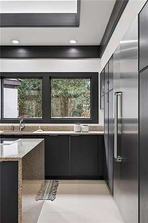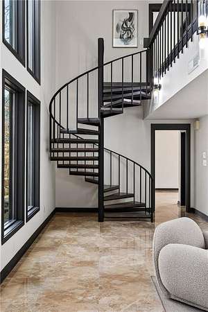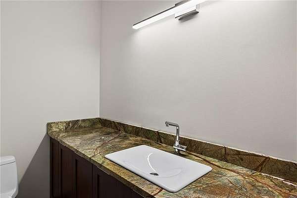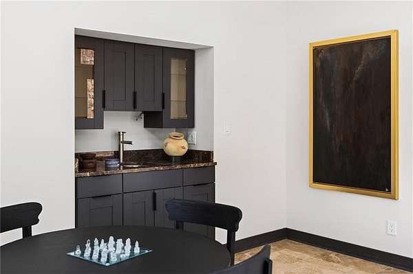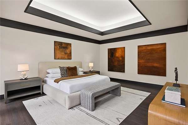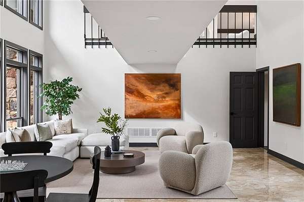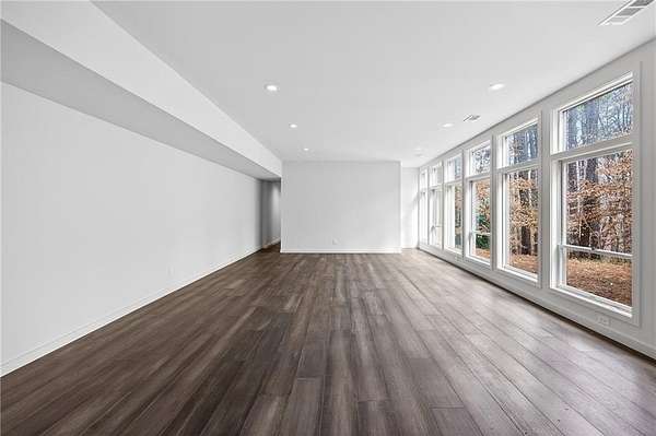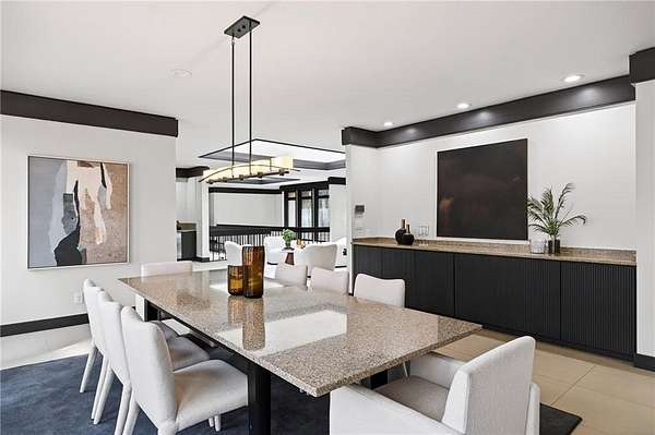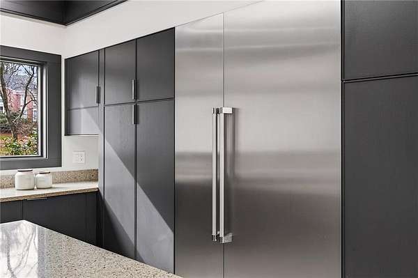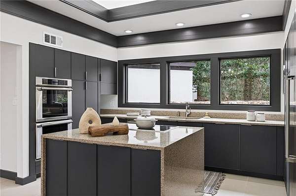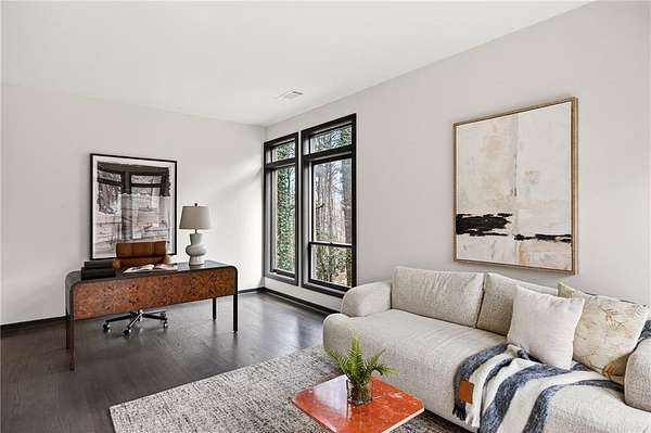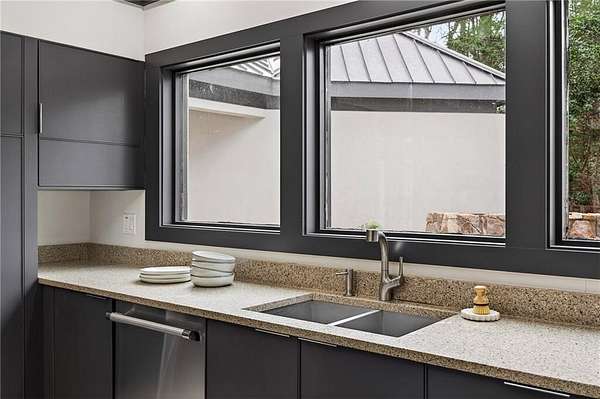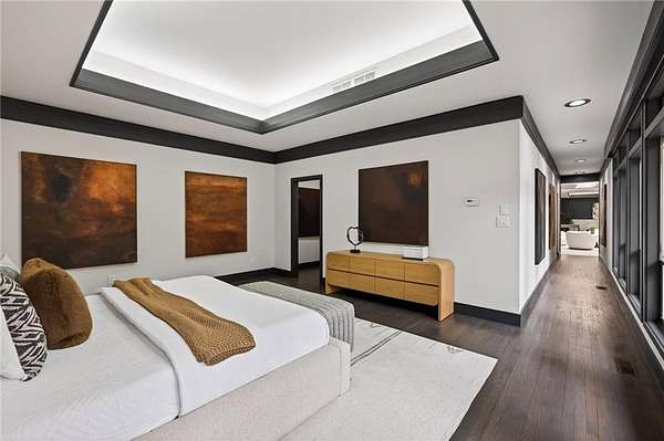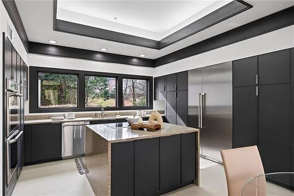 A masterfully reimagined Mid-Century Modern residence, discreetly set within the coveted enclave of Winterthur in Sandy Springs. Privately nestled on an extraordinary 2.6-acre wooded lot, this architecturally significant home offers rare seclusion while celebrating its natural surroundings through thoughtful design and abundant light. The open-concept floor plan unfolds across expansive living spaces defined by large-format tile and rich hardwood flooring, oversized picture windows, and a dramatic central atrium skylight that drenches the interiors in natural light. The kitchen is a study in modern restraint, featuring sleek inset flat-paneled cabinetry, waterfall stone countertops, and a professional-grade stainless steel appliance suite-both sculptural and highly functional. Designed for effortless entertaining, the home centers around an open-concept cocktail lounge with adjoining wet bar, ice maker, and refrigerator, flowing seamlessly into a fireside sunken family room anchored by a sleek modern fireplace. An adjacent sunroom overlooks the serene wooded landscape, creating a tranquil indoor-outdoor connection.The primary suite on the main level is a true retreat, occupying its own private wing and offering a spa-inspired bathroom with freestanding soaking tub, dual vanities, dedicated makeup vanity, tiled walk-in shower, and a private courtyard. A main-level guest suite enjoys a private balcony and marble-clad bathroom. Downstairs, an entertainer's haven awaits with a striking two-story family room, second wet bar, additional ensuite guest suite, and an oversized recreation room complemented by a powder bath-ideal for hosting, relaxing, or multi-generational living. At the heart of the property lies a resort-style pool and spa surrounded by stone patios and mature woodland, creating a private sanctuary rarely found so close to the city. Additional features include a two-car garage, standing-seam metal roof, hard-coat masonry stucco exterior, and professionally designed landscape lighting. Winterthur remains one of metro Atlanta's most coveted communities, offering zero cut-through streets, direct Chattahoochee River access, scenic walking trails, close proximity to major highways, and access to exceptional public and private schools-an unrivaled blend of privacy, architecture, and lifestyle.