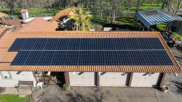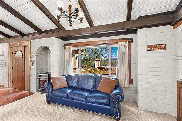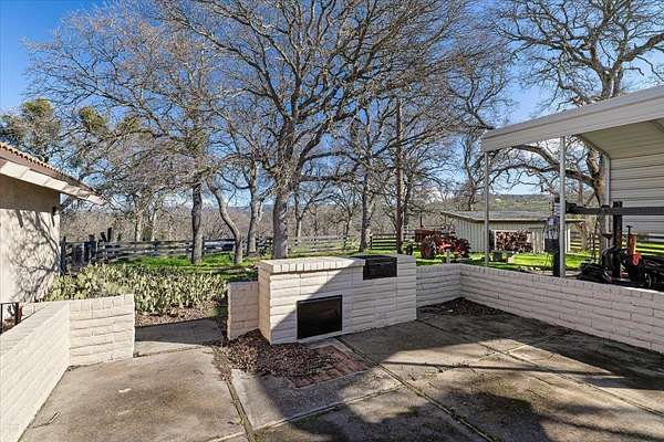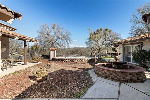 Panoramic valley and sunset views from this Spanish style home sitting on usable 3.68 acres fenced and loaded with oaks, perfect for livestock. The courtyard with water fountain is the centerpiece for the detached second primary suite featuring Spanish tile floors, vaulted wood ceiling and full bath. As you enter the main home, the living room is a grand space, featuring a fireplace insert that serves as a warm focal point, vaulted beamed ceiling that complements the wood ceiling, while the wood framed door and entry casings add a touch of rustic charm. The bedroom provides a personal retreat, enhanced by the refined touch of crown molding and real oak wood floors adding architectural interest. The kitchen is equipped for culinary adventures, boasting tile granite and wood countertops that provide ample workspace and a high-end range oven. Large walk-in pantry offers an abundance of storage while the 1/2 bath, office/den, inside laundry room and sitting area complete the floorplan. Three car garage, metal carport, storage shed, animal shelter, paved driveway and entry gate all enhance this property. Embrace the opportunity to make this exceptional Calaveras foothill property your personal haven.