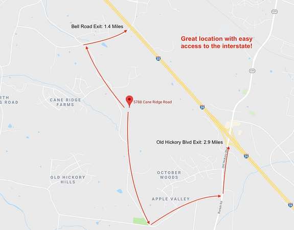 From Nashville: Get on I-24 E from James Robertson Pkwy. Follow I-24 E to TN-254 W/Bell Rd. Take exit 59 from I-24 E. Turn right onto TN-254 W/Bell Rd, then turn left onto Cane Ridge Rd. Property is 2.3 mi on Left.