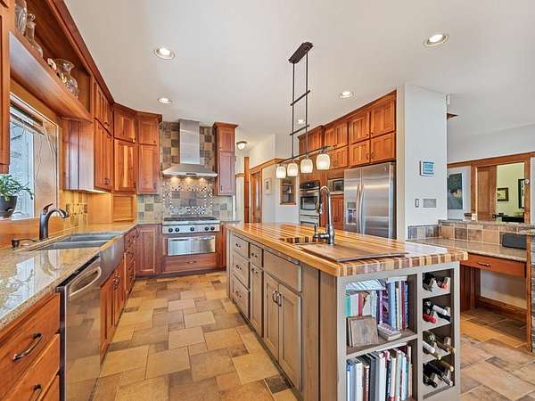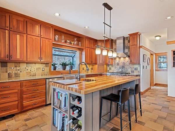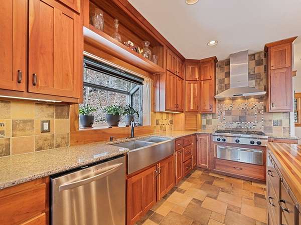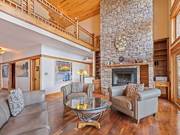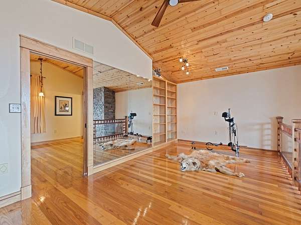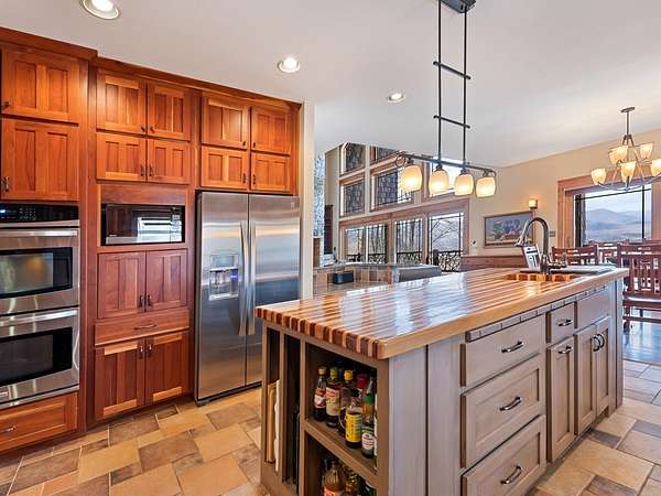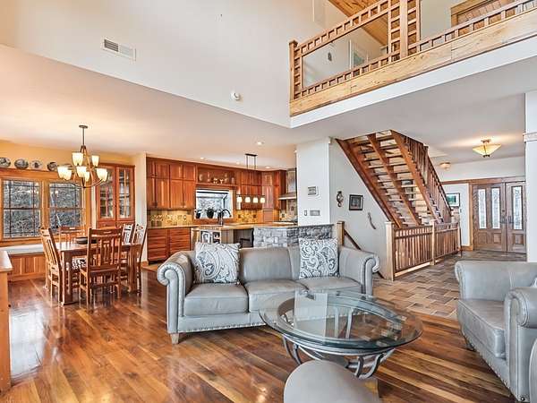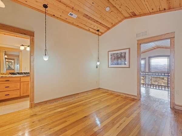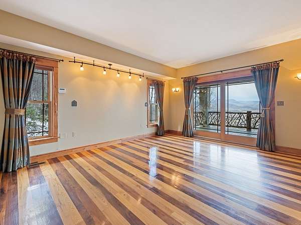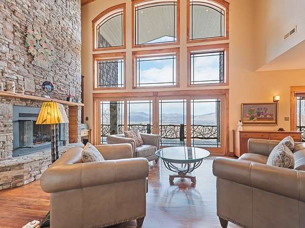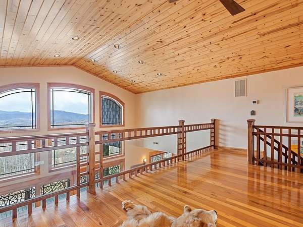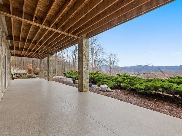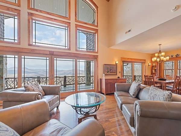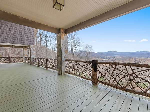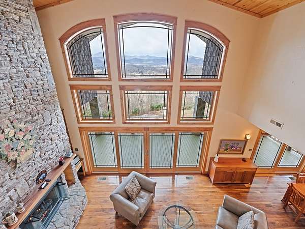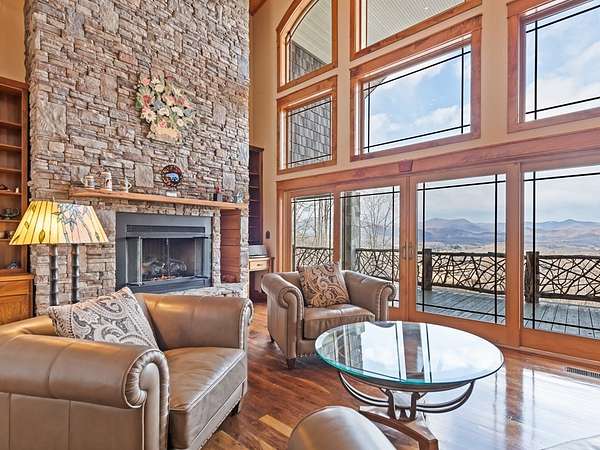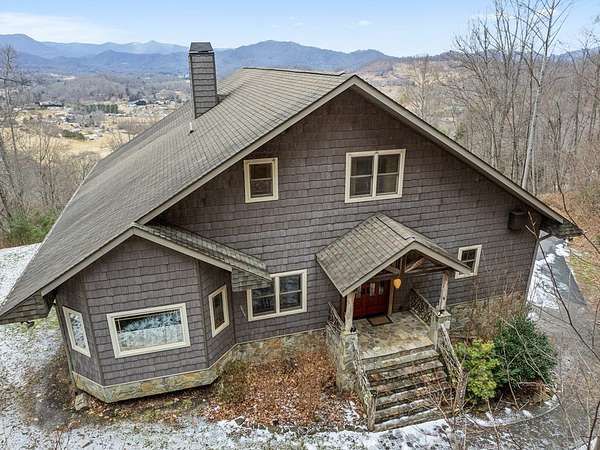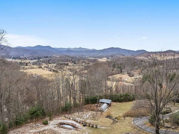 Specially crafted mountain residence on 6.38 private acres with outstanding long-range, year-round views and dramatic sunsets, just 10 minutes to Waynesville. A covered front porch creates the perfect setting for outdoor entertaining against a breathtaking backdrop. Built with enduring quality, the home features CertainTeed siding, architectural shingles, and Pollard solid wood windows and doors. Inside, custom woodwork crafted from Wild Cherry, Black Walnut, and Maple harvested from the property adds rare authenticity to the floors, kitchen island, and surfaces. The chef's kitchen offers a gas range, double ovens with warming drawer, pantry, and heated floors. The living area features a stone gas-log fireplace and expansive view-filled windows. The primary suite is a private retreat with heated floors, tile shower with multiple heads, Jacuzzi tub, granite vanities, and blackout blinds. An en suite guest bedroom plus a flexible third bedroom/office provide versatility. The unfinished daylight basement includes a woodstove and sauna. Greenhouse, outbuildings, and gated drive with intercom and camera complete this private mountain escape.