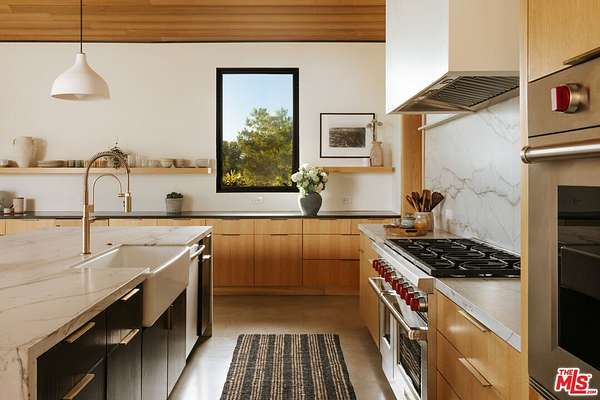 Set on a private knoll overlooking Zuma Beach and Bonsall Canyon, 5792 Calpine Drive is an intentionally designed modern compound spanning 1.8 acres, with expansive ocean and mountain views.Upon entering through the private entrance, this thoughtfully designed modern farmhouse unfolds via a gated gravel motor court that serves multiple detached structures, creating a sense of arrival, privacy, and luxury rarely found in a lease offering.The main residence is anchored by vaulted, cedar-clad ceilings, polished concrete and European white oak plank floors, and expansive sliding glass walls that frame the surrounding landscape. Living and dining spaces open seamlessly to curated outdoor rooms designed for entertaining, lounging, and sunset gatherings. A statement fireplace and clean architectural lines ground the interiors with warmth and purpose.The open chef's kitchen is both sculptural and functional, featuring custom cabinetry, stone countertops, premium appliances, and a generous island. A secondary prep kitchen and pantry enhance functionality and support effortless hosting.Private bedroom suites are positioned throughout the compound for comfort and privacy. The primary suite offers a serene retreat with a spa-inspired bath, freestanding soaking tub, glass-enclosed shower, and tranquil hillside views. Additional baths and powder rooms showcase elevated finishes, including bespoke stonework, refined fixtures, and richly patterned wallpaper that adds depth and character.Outdoor living is woven throughout the property, with multiple dining and seating areas, stone pathways, native landscaping, an open-air shower, cold plunge, and a cedar soaking tub set against expansive coastal vistas. A detached wellness studio with gym and infrared sauna completes the experience, while a private, detached one-bedroom guest house provides flexibility for guests, creative use, or extended stays.A rare opportunity to lease a design-forward modern compound that balances privacy, architectural integrity, and a relaxed coastal sensibility.Located just moments from Malibu's beaches, hiking and horse trails, restaurants, and lifestyle amenities.