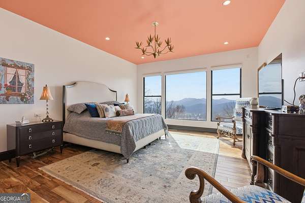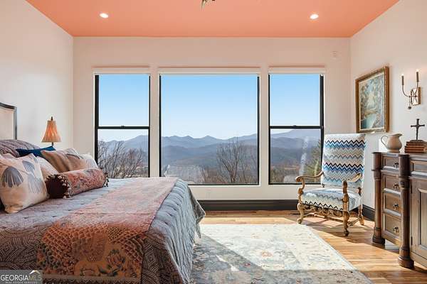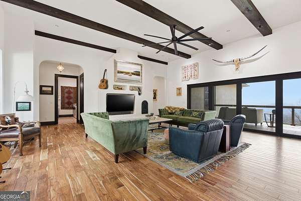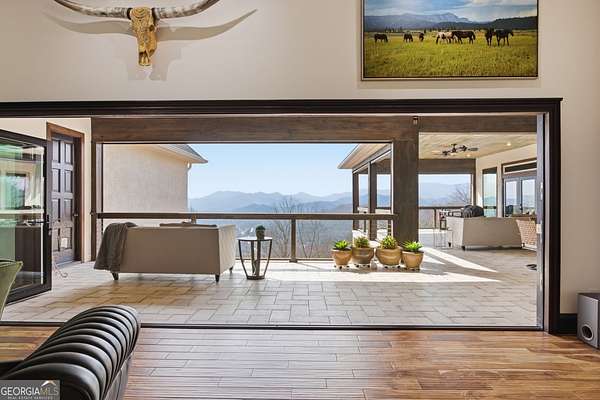 Luxurious Spanish/Mediterranean Custom Estate perched on 5.19 acres, BOASTING LONG RANGE MOUNTAIN VIEWS!! This One level, zero steps, home blends architectural elegance with exceptional craftsmanship. Soaring 10 and 12-foot ceilings, Marvin windows, Acacia hardwood flooring, and 8-foot mahogany doors create a warm, refined atmosphere. Remote controlled shades, a whole-home sound system, instant hot and soft water systems add effortless comfort. The luxurious primary suite features a custom designed closet and a spa-inspired bath, wrapped in 4 x 8 porcelain tile walls, paired with a premium Toto Bidet. The gourmet kitchen showcases Cafe' appliances, an induction cooktop and stunning Quartz countertops. 20 ft Euro-wall door opens the main living area onto a spectacular 900 sq ft deck with tile flooring and cypress ceiling- perfect for seamless indoor/outdoor living. Additional highlights include an oversized 2 car garage with cedar doors, with many more thoughtful upgrades throughout.
