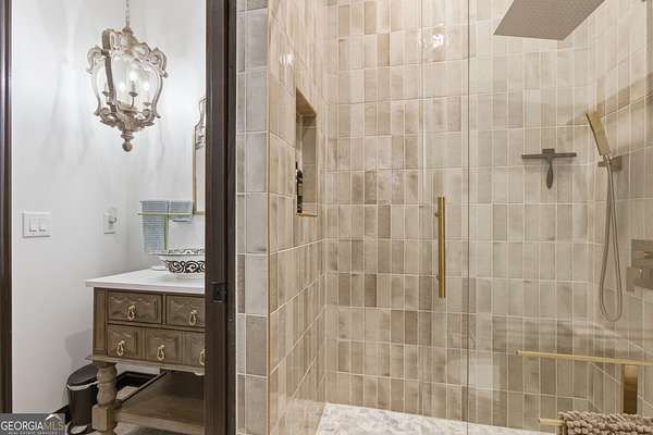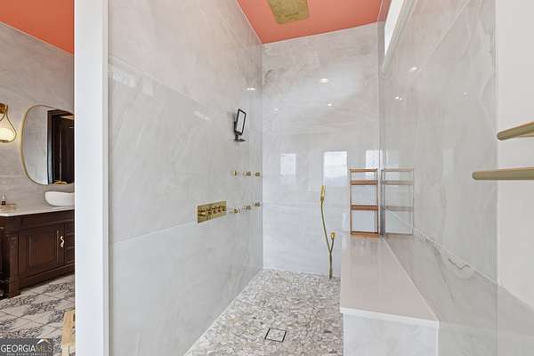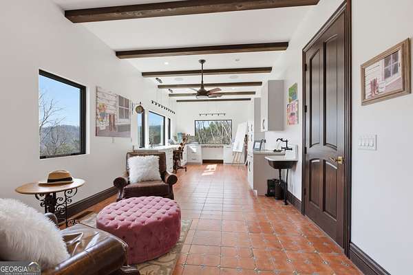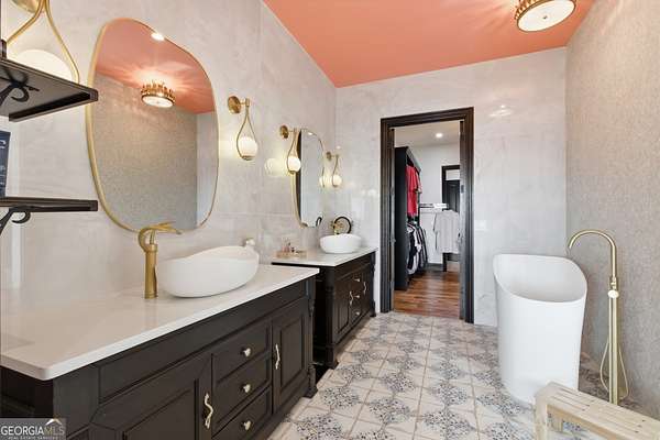 - Beamed Ceilings, Double Vanity, High Ceilings, Master On Main Level, Soaking Tub, Tile Bath, Walk-In Closet(s)