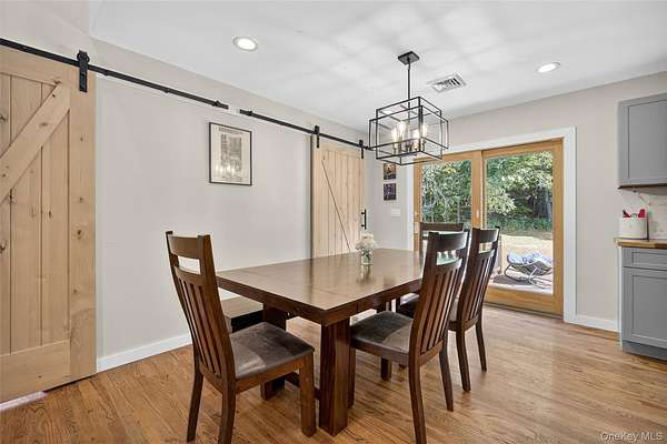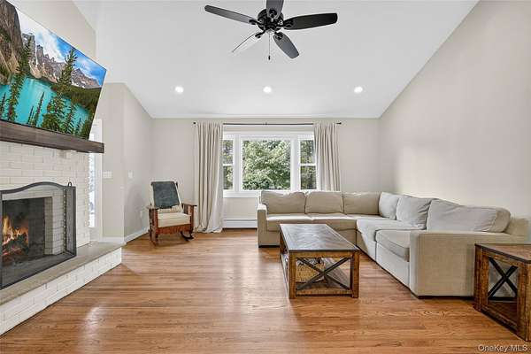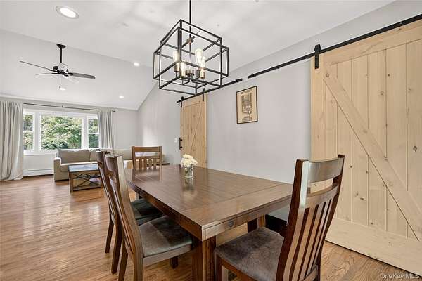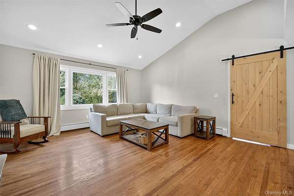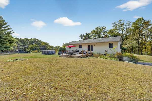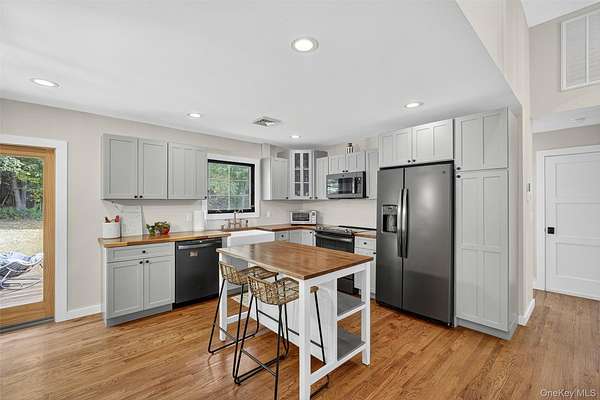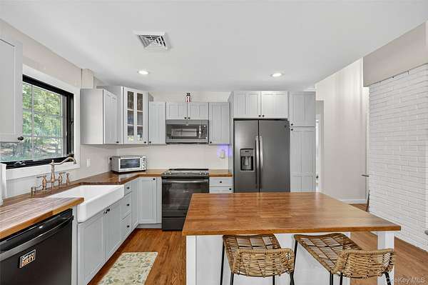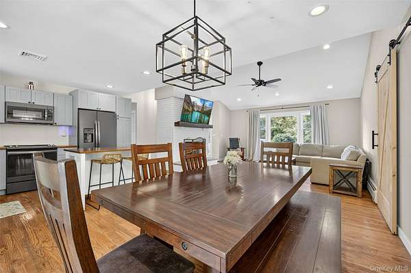 Welcome to this beautifully updated Ranch in Pleasant Valley offering 3 bedrooms, 2 bathrooms, and 1,250 square feet of comfortable living space. This home combines modern updates with classic charm, making it move-in ready. The spacious living room features hardwood floors, vaulted ceilings, and a cozy fireplace as its centerpiece. Natural light fills the space, creating a warm and inviting atmosphere. The dining area opens directly to the back deck through sliding glass doors, making indoor-outdoor entertaining seamless. The kitchen has been tastefully renovated with shaker-style cabinetry, butcher block counters, and stainless steel appliances. A center island with seating adds both style and function. A walk-in pantry with custom shelving provides excellent storage. The bedrooms are well-sized, with the primary offering generous closet space. The full bathroom is fully remodeled with dual sinks, modern tile, and a sleek design. An additional half bath adds convenience. Enjoy outdoor living on the large back deck overlooking a level yard, perfect for gatherings or quiet evenings. The property includes a two-car garage, garden shed, and plenty of room for gardening or recreation. Set in a peaceful location closer to the Lagrange area, this home offers both comfort and convenience. With its thoughtful updates, functional layout, and inviting outdoor space, this is a wonderful opportunity in the heart of Dutchess County.
