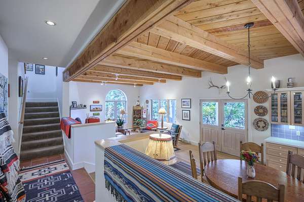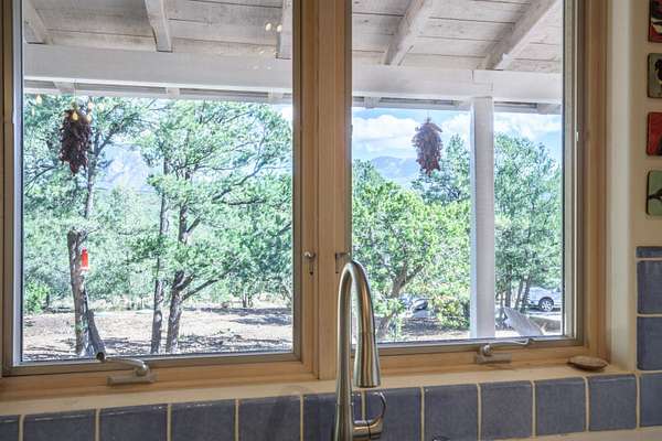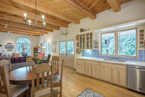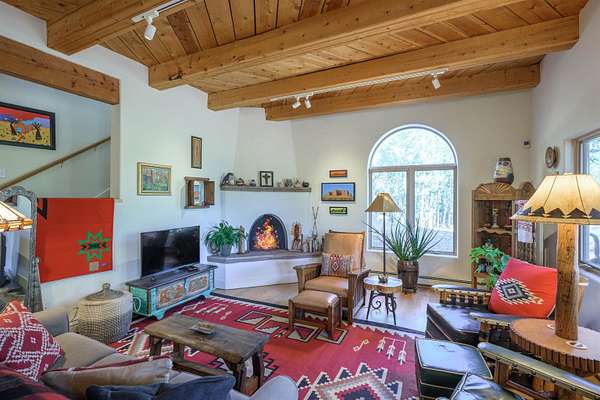 Peaceful mountain living meets timeless New Mexico charm in this beautifully updated territorial-style home on 2.54 wooded acres between Taos Ski Valley and the Town of Taos. Thoughtfully designed for comfort and connection to nature, this 3-bedroom, 2.5-bath home offers 2,064 sq ft of warm, light-filled living space. The main level features a welcoming living room with a southwest-style kiva fireplace, open-beam ceilings, and large windows that frame forest and mountain views. The inviting kitchen blends modern convenience with traditional detail and opens to the dining area for easy entertaining. The private primary suite has an updated ensuite bath, while the upper level provides a spacious multi-purpose room ideal for guests, a studio, or a family retreat. Enjoy expansive outdoor living on two covered decks and a flagstone patio surrounded by low adobe walls-perfect for morning coffee or evenings by the fire pit under starry skies. The detached garage, mature trees, and serene mountain backdrop make this property a rare Taos-area gem-move-in ready and minutes to Arroyo Seco, hiking, and skiing. This home is ready for your arrival to enjoy the Winter Holidays & Ski Season Joy! PLEASE NOTE: The current owners will need to remain in the property until the end of January 2026. They are open to closing early and engaging in a lease-back agreement until their departure. HOA fee is $200/yr for road maintenance. The seller has shared a design plan for a potential addition to the house - it is located under the "documents" section.