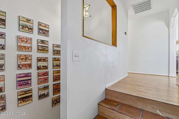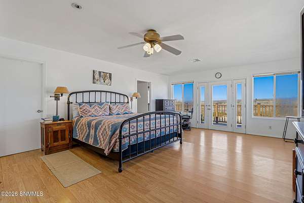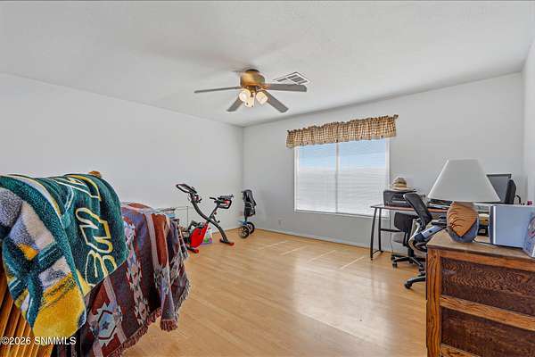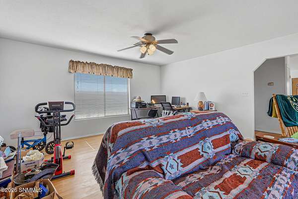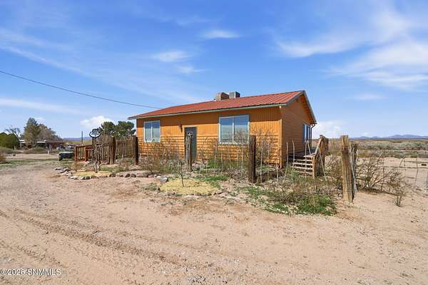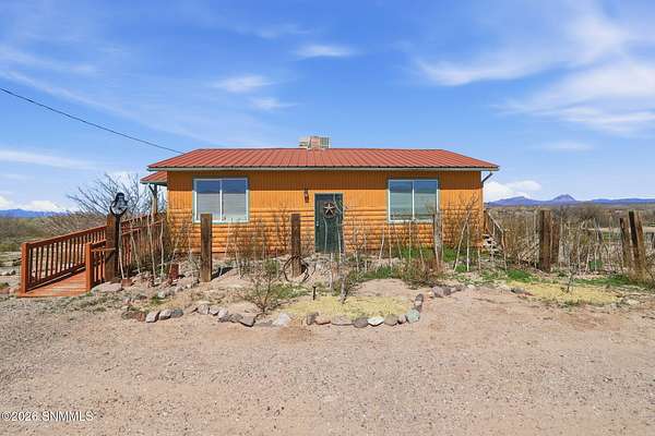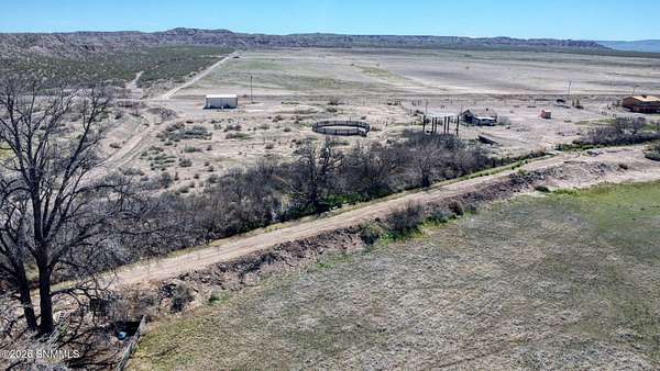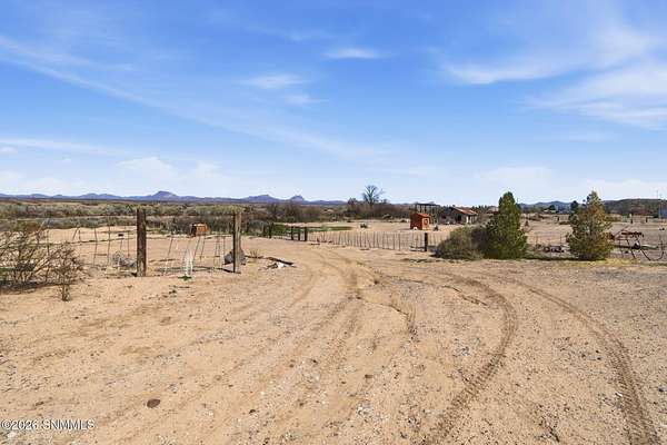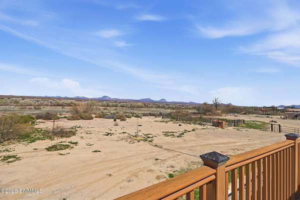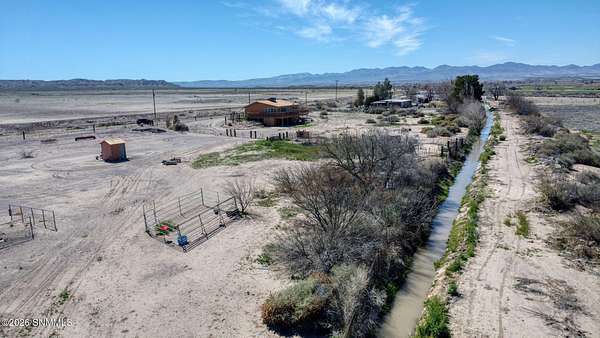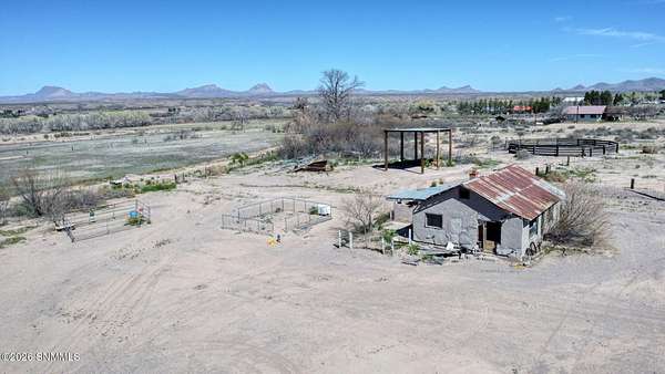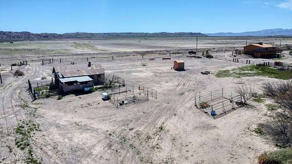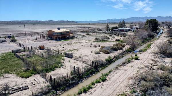 65+ Acres with Water Rights in Virden - Irrigated Land & Mountain Views. Opportunity awaits on this beautiful property offering just over 65 acres of irrigated farmland in scenic Virden with stunning views in every direction, including Steeple Rock. The land is well laid out and ready for agricultural or livestock use with 8 separate pastures and 41.5 irrigation water rights from the New Model Canal. The property includes infrastructure ideal for horse or livestock operations, including covered hay storage, wooden round pen, small arena area, hot walker, multiple pens including a dog/goat run, and an old adobe structure converted to storage with two stalls. The two-story log exterior home offers 3 bedrooms and 2 bathrooms and is positioned to capture the surrounding mountain and farmland views. Features include a large upstairs primary suite with office area, walk-in shower and soaking tub, kitchen with breakfast bar and adjoining dining space, downstairs living/family room with bar, and a second kitchen area
