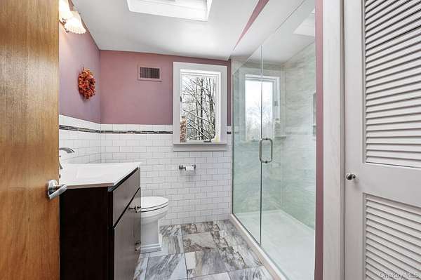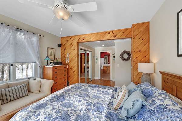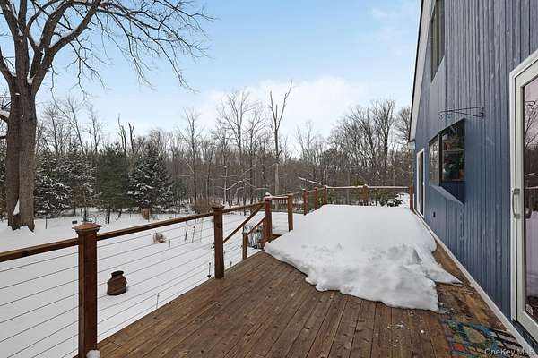 Introducing this Tranquil Haven on Wildwood Drive! This contemporary Cape is set on 3 beautiful acres with 3 bedrooms and 3 baths offering a blend of modern upgrades and cozy comfort with many features throughout. Step inside to discover a thoughtfully designed interior featuring hardwood floors, upgraded carpeting, newer thermal windows, bright skylights, and stylish arched doorways. The kitchen is warm and inviting with wood cabinets, tiled countertops and back splash design, pine board wall accents, an eat at counter for casual meals as well as dining area for entertaining. Bring nature inside with your kitchen garden window or walk right out the sliding doors to birdwatch from the large new cedar deck! The living room impresses with hardwood floors, a brick fireplace and built-in entertainment center with granite counters. Unwind in the first floor primary bedroom with its en-suite bathroom offering a soaking jetted tub, a separate shower, makeup vanity, and double closets. Step out of the sliding doors from your bedroom onto the private deck with your morning coffee. Upstairs, two additional bedrooms offer hardwood floors, ceiling fans, plenty of closets and a full modern shower bathroom. The finished lower level presents a separate laundry room, utility room, a versatile bonus space for an office or hobby spot, and a spacious family room with full-size windows and separate entrance. Bring your creativity for endless options here! The serene backyard has plenty of space for outdoor gatherings with stone walls, mature gardens, a fire pit and even a peaceful creek to sit by. Enjoy low maintenance living with a metal roof, bluestone walkways and paved driveway. This property also features a large detached two-story barn perfect for storage or garage space with a second story available to finish for a studio space. Don't miss out on the opportunity to call this Tranquil Haven your new home!