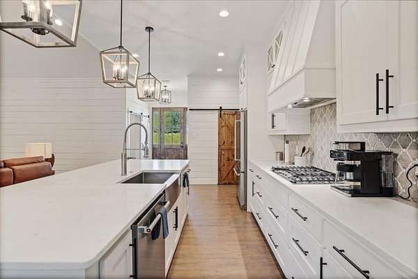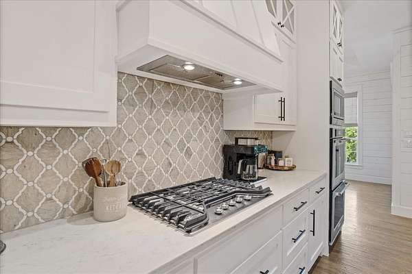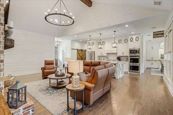 Built by renowned local builder Tony Miller, every element of this home showcases exceptional craftsmanship and attention to detail. White oak flooring flows throughout the interior. The kitchen is a chef's dream featuring a spacious island with quartz counters and tumbled marble backsplash, stainless farmhouse sink, gas stove with a custom hood, double ovens, and lighted custom cabinetry. The kitchen is open to the family room which features a floor-to-ceiling brick fireplace flanked by custom built-ins. The dramatic light fixtures add another layer of character and style.