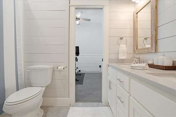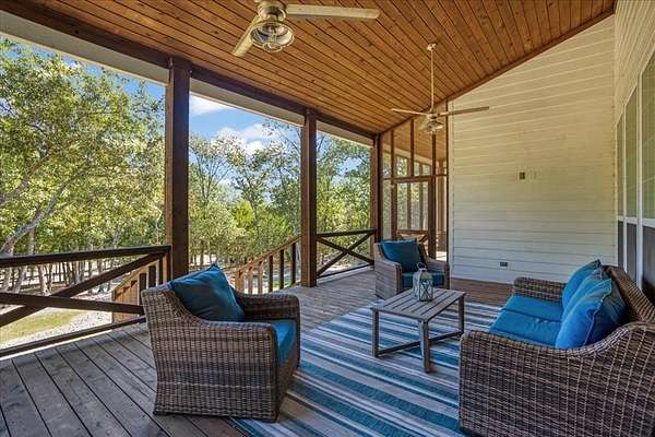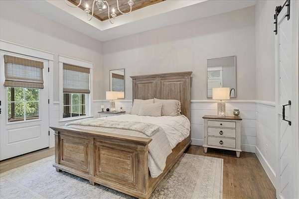 The primary ensuite offers a luxurious retreat with a tray ceiling featuring a stained shiplap insert, dual vanities, a walk-in shower, and a custom closet. Step out onto your private screened porch to enjoy tranquil mornings surrounded by nature.