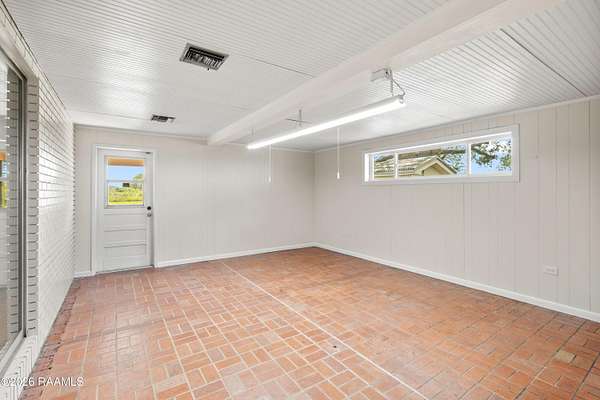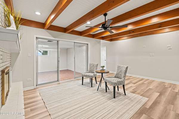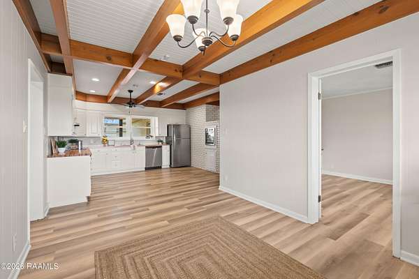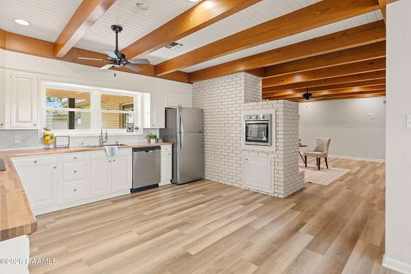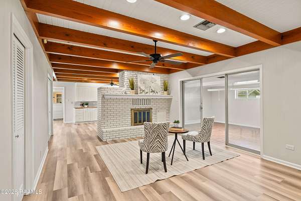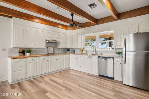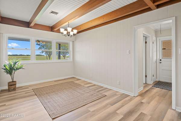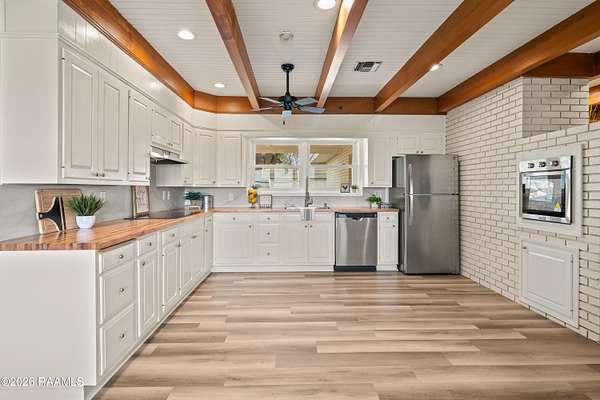 Recently updated and move-in ready, this 3-bedroom, 3-bathroom home is situated on 1.63 acres. With fresh curb appeal and a large circular driveway, you'll feel right at home from the moment you arrive. Step inside to freshly painted walls and new vinyl plank flooring that flow throughout the home. Just off the entryway, a formal dining room provides a great space for gatherings. The updated kitchen is full of character, featuring wood-beamed ceilings, butcher block countertops, stainless steel appliances, and an open layout to the dining area. The charm continues into the spacious living room, where wood-beamed ceilings and a cozy wood-burning fireplace create a warm and inviting atmosphere. Just off the kitchen, you'll find a dedicated office and a generously sized laundry room. A versatile game or bonus room with brick paver flooring is located off the living area. The primary suite is spacious and features dual closets and a private en-suite bathroom. The first guest bedroom also includes its own en-suite bath and dual closets, while the second guest bedroom offers a large closet and access to a full guest bathroom with a tiled shower. Storage won't be an issue, with an abundance of closets throughout the home. Outside, enjoy a covered patio, a 2-car garage with additional storage rooms, and a peaceful country setting surrounded by mature trees. Don't miss your chance to own this beautifully updated property--schedule your private showing today!