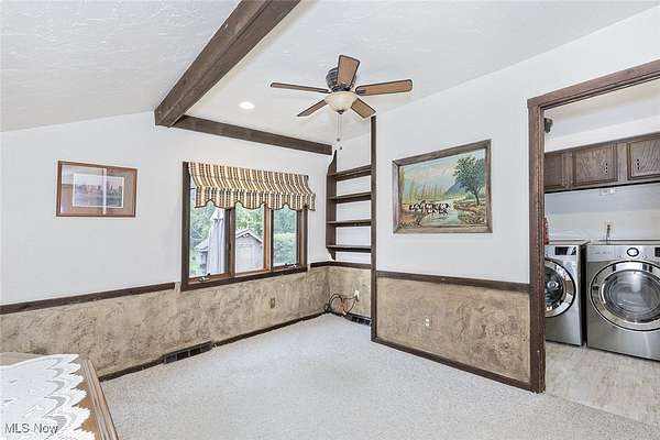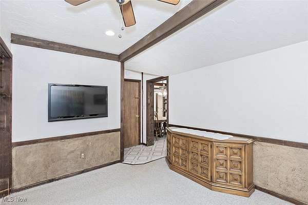 - Beamed Ceilings, Built In Features, Ceiling Fans, Crown Molding, Recessed Lighting, Wet Bar