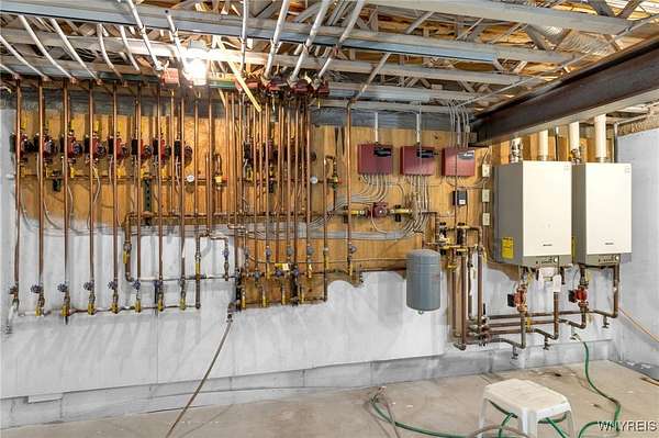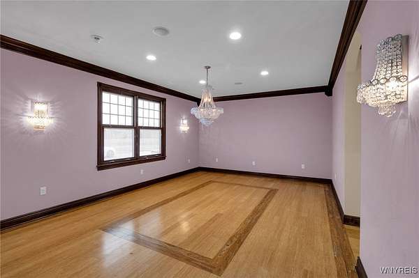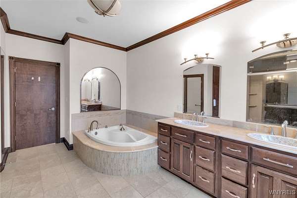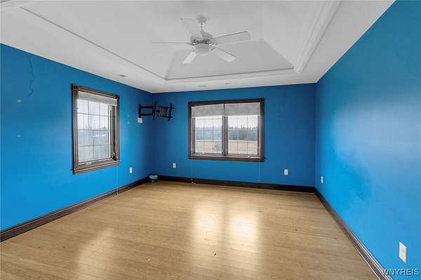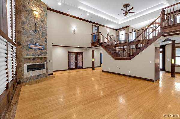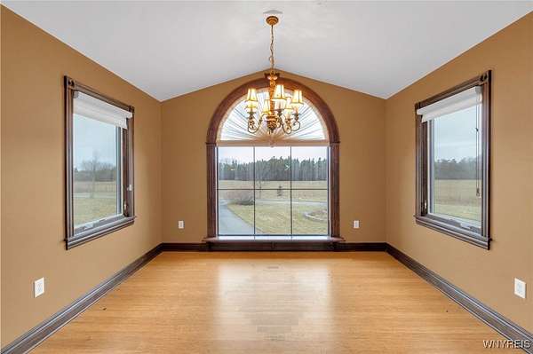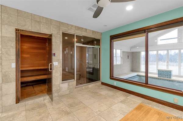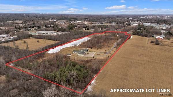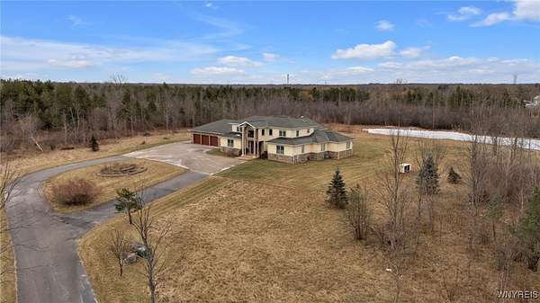 Set on 18.8 private acres, this expansive 5,725 sq ft (differs from tax records as not to include the 4,000 SF below grade partially finished basement) estate offers a rare combination of scale, privacy, architectural presence, and future upside. The property features 4 bedrooms, 5 full baths, and 2 half baths with a layout designed around both formal entertaining and everyday living. A signature grand stairwell framed by travertine-lined illuminated columns anchors the home. Interior highlights include a two-story great room with stone-adorned fireplace, a massive formal dining room, bamboo hardwood floors, rich oak trim throughout, pan ceilings with recessed lighting, and a gourmet kitchen with abundant granite counter space and an oversized eat-in breakfast nook. The primary ensuite wing includes a dedicated den, a four-piece bath, private commode and bidet, and generous closet space. The second level offers additional bedroom suites, a large seating/landing area, and views overlooking the great room. A separate recreation and wellness wing includes an indoor pool, workout room with full bath, sauna and shower, and a three-season sunroom with folding doors that open to the exterior. Outdoor features include a rear stamped concrete patio courtyard, private pond, exterior fire pit, and extensive grounds. The lower level is partially finished and studded out, providing a clean slate for future build-out. Mechanical features include radiant heated floors, a heated driveway, and substantial utility infrastructure. Garage capacity includes a 3.5-car attached garage plus an additional detached garage. Additional value-add: the parcel may offer potential for up to two additional building lots for future development (subject to municipal approvals and buyer due diligence). Property is being sold as-is. A unique opportunity for buyers seeking acreage, amenities, and long-term potential within convenient proximity to Buffalo!