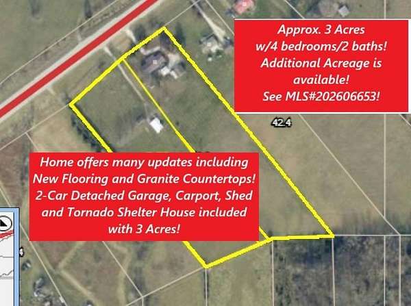 Est $2,137/mo4 bedroom/2 baths with many updates! Includes 2-Car detached Garage and 2-Car Carport and the shed stays! Home listed with approx. 3+/- Acres or Home can be purchased with all of the acreage, see MLS#202606653, with home being sold w/6.2+/- Acres (total). Interior and Exterior security cameras onsite do "not" stay. Seller is a Licensed Indiana Real Estate Broker and is the Listing Broker. Property is Sold As Is @ Closing. Inspections/Survey WELCOME @ Buyer's expense. More photos to follow!
