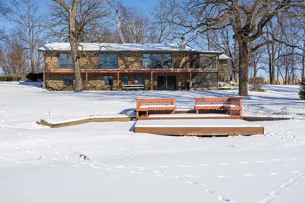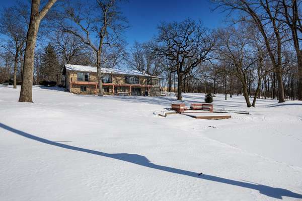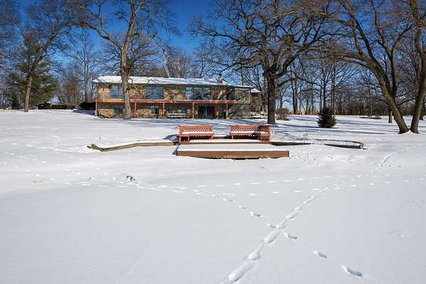 MOTIVED SELLER! STUNNING 5-ACRE ESTATE WITH PRIVATE POND AND BREATHTAKING VIEWS! Experience the ultimate tranquility and outdoor living with this exceptional property. Nestled in a picturesque, park-like setting, this 5-acre estate boasts a serene 3.5-acre pond perfect for fishing, kayaking, paddle boating, bird watching, and more! In addition to the private pond, the property boasts river frontage of the winding Nippersink Creek just steps away from a 520 acre conservation park offering miles of nature walking nature trails. This charming brick ranch home offers low- maintenance living, with a durable all-brick exterior and vinyl-clad windows. Enjoy panoramic views of the pond and lush surroundings from the expansive wrap-around deck or relax in the screened porch, ideal for hours of outdoor enjoyment. Step inside to an updated, open-concept floor plan featuring a modern kitchen with granite countertops, stainless steel appliances, and a convenient breakfast bar. The walkout basement provides even more living space, including a cozy family room, two additional bedrooms with stunning pond views, a recreation room, full bath, utility room, and abundant storage. The property is a nature lover's dream, with landscaping that blooms beautifully in the spring and summer with unbelievable panoramic winter views of snow blanketed mature oak and shag bark hickory trees. Additional features include easy access to nearby amenities like The Ice Age Trail, schools, a ski hill, the Chain O' Lakes, shopping, dining, concerts, walk or bike ride to downtown Richmond, Glacial Park, or just a 12 minute ride to Lake Geneva, WI, and more! Don't miss the chance to own this one-of-a- kind retreat-schedule your private showing today!