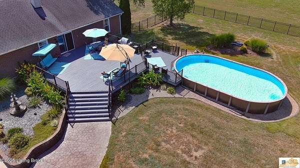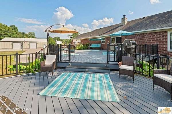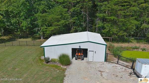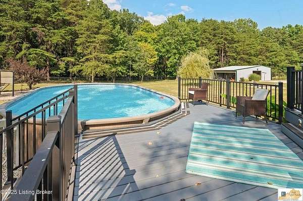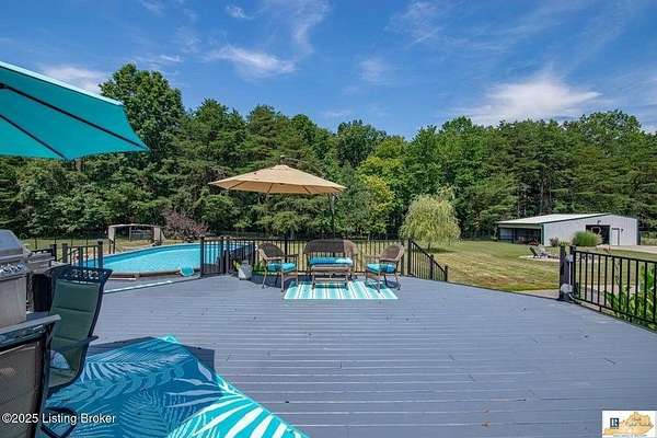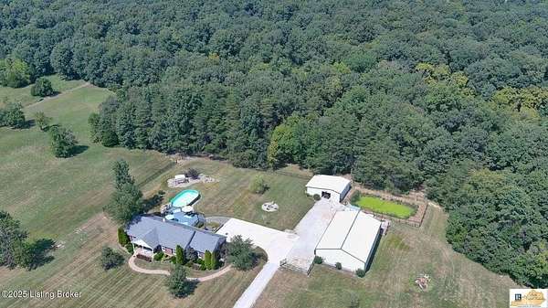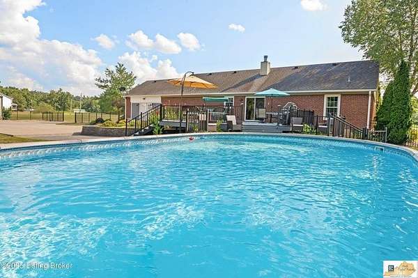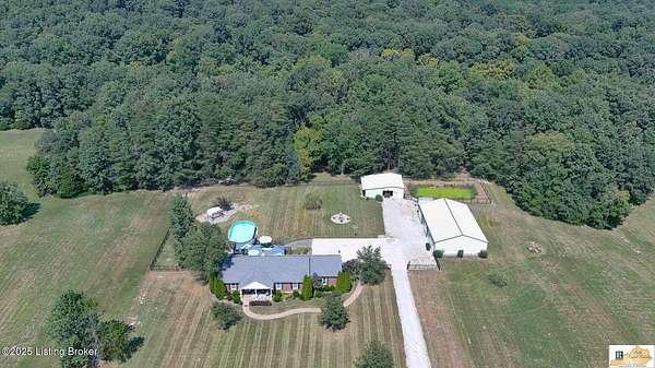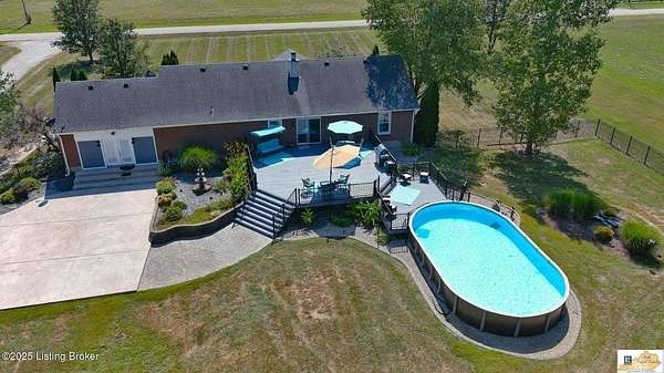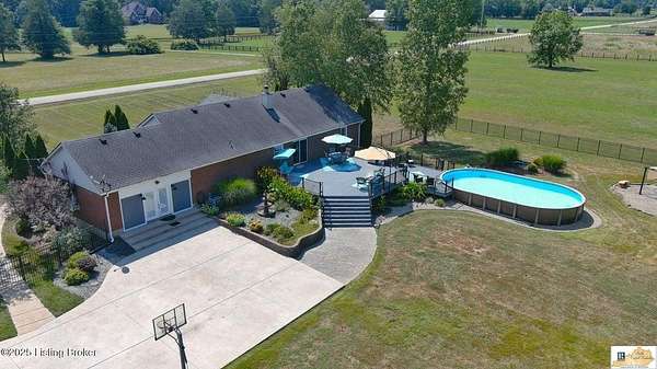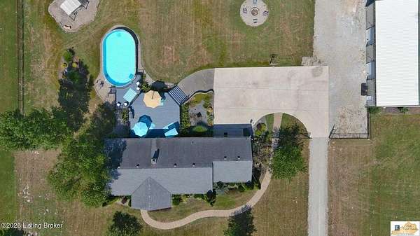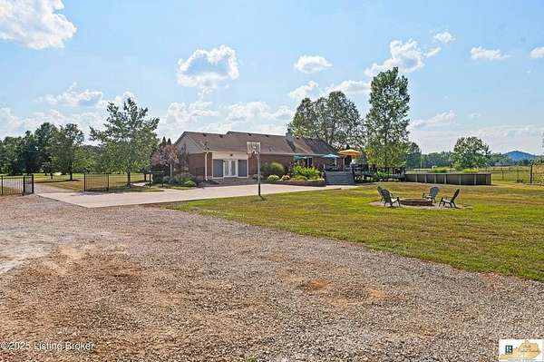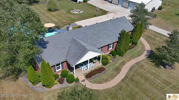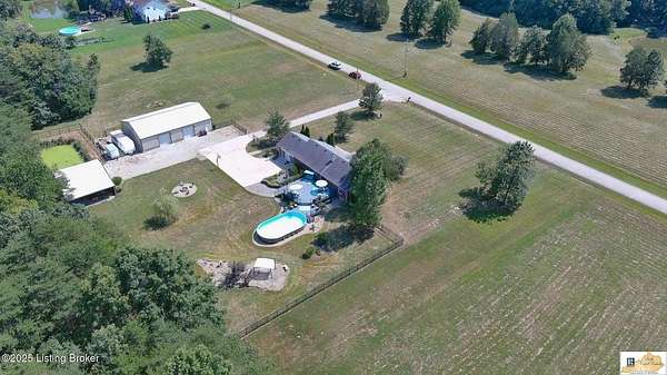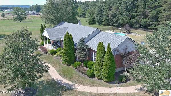 This picture-perfect ranch looks like it stepped out of the pages of a magazine. Offering over 2,200 square feet of living space, it's perfectly situated on more than 10 acres. The open layout is anchored by a striking fireplace at the heart of the living room, while the large eat-in kitchen with a center island, extra seating, and inviting flow makes entertaining effortless. The serene primary suite features a private bath. A spacious game room offers endless fun and flexibility. Outdoors, charm meets function with an expansive patio and sparkling pool. A 40x60 pole barn with 220 amp service, plus a bonus barn with electric are perfect for hobbies or storage. An electric gate with remote opener completes this exceptional property, offering both convenience and privacy.