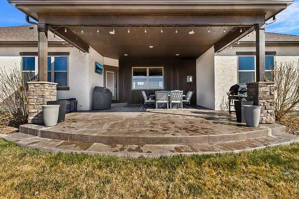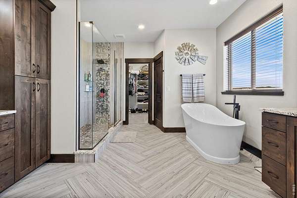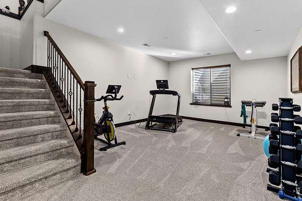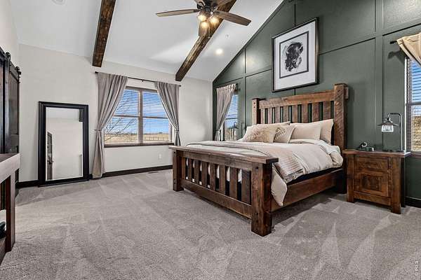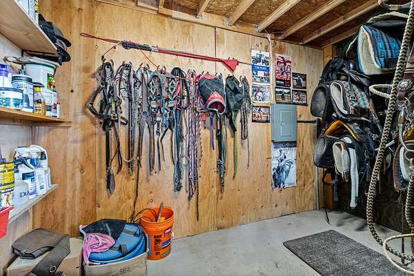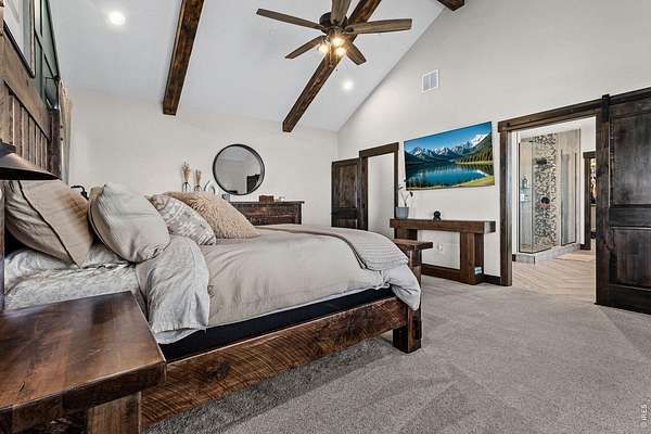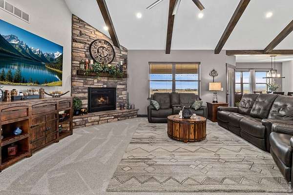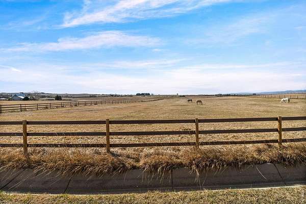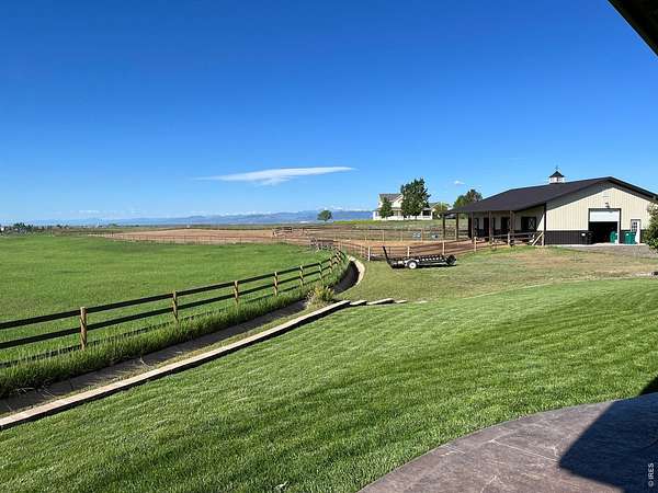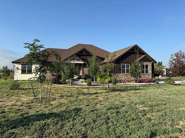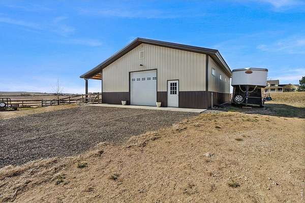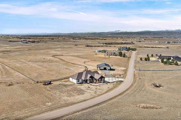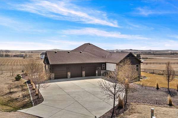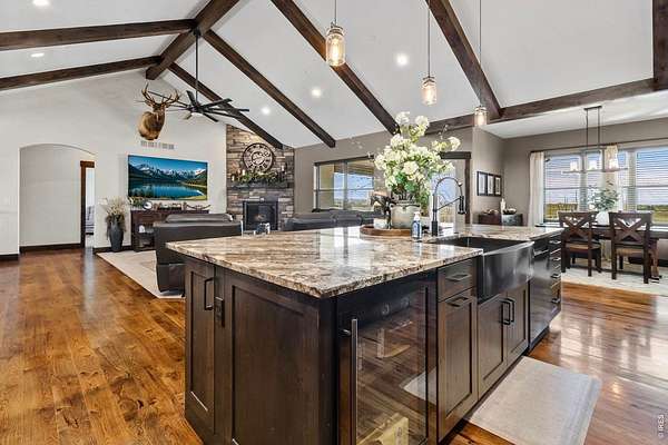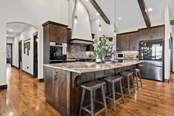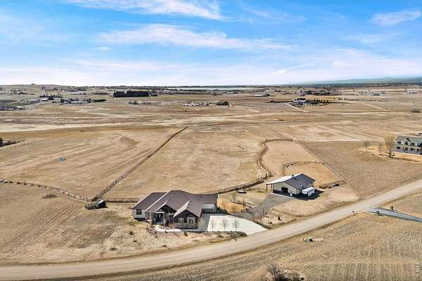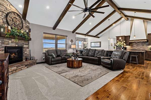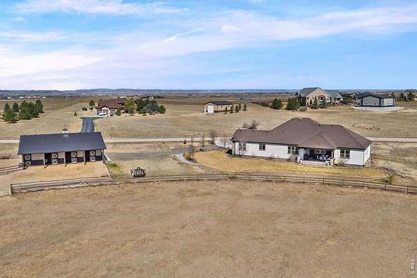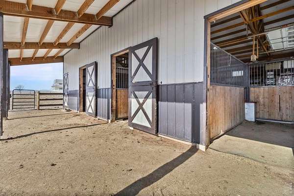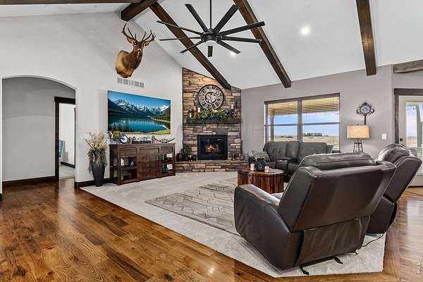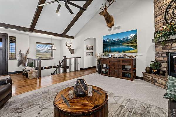 Custom 4-bedroom, 4-bath home set on over 10 acres, offering the perfect blend of comfort, craftsmanship, and elbow room. The open-concept floor plan is enhanced by vaulted ceilings with exposed beams in the kitchen, living room, and primary suite, creating a warm and inviting atmosphere. The gourmet kitchen features high-end Decor appliances, beautifully complemented by rustic hickory flooring and rich knotty alder cabinetry, trim, and doors throughout the home. A stunning stone fireplace anchors the main living space, while the basement is already prepped for a wet bar-ideal for future entertaining. Designed with equestrian living in mind, the property includes an impressive 48x36 barn that offers four rubber-matted stalls, a full concrete floor, and heated automatic waterers for year-round convenience, plus shared irrigation water rights, vinyl horse fencing, and is thoughtfully divided into two pastures with a riding arena.