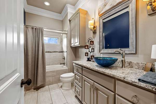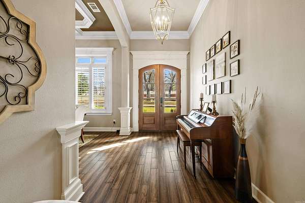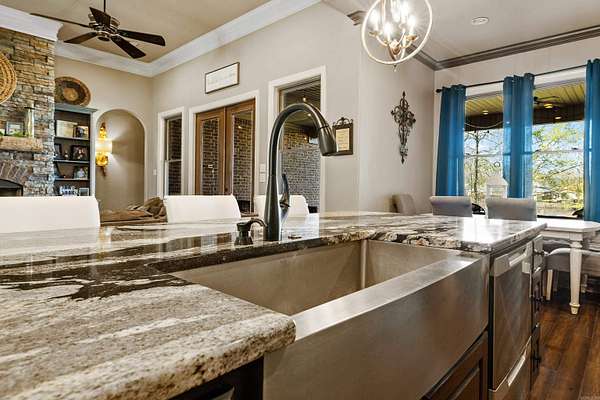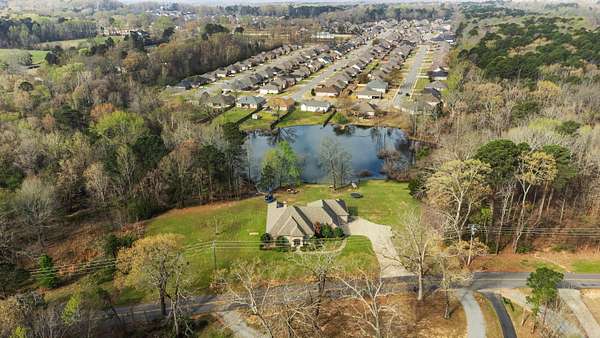 Centrally located home on 4 scenic acres with a pond, this thoughtfully designed property offers space, privacy, and custom finishes throughout. The formal dining area connects seamlessly through a buffet and pantry to the kitchen. Entertain easily with a commercial fridge/freezer combo, dual ovens, wine fridge, eat in nook and desk area for managing daily life. All overlooking the living room anchored by a beautiful stone fireplace, rich hardwood floors and archways. The split layout features Jack-and-Jill bedrooms on one corner, a private guest suite with its own bath on another, and a spacious primary retreat tucked away with a dual vanity & seating area, free standing tub, custom shower, and an oversized walk-in closet. Additional highlights include a private office with storm shelter, large locker space and laundry room adding to the home’s design. There is foam insulation for efficiency, generator wiring already in place, and a large walk-up attic offering excellent storage. Enjoy peaceful views, fishing, fire pit and wild geese while relaxing in the back yard. With plenty of room to roam and close proximity to town, this is truly a one-of-a-kind property.