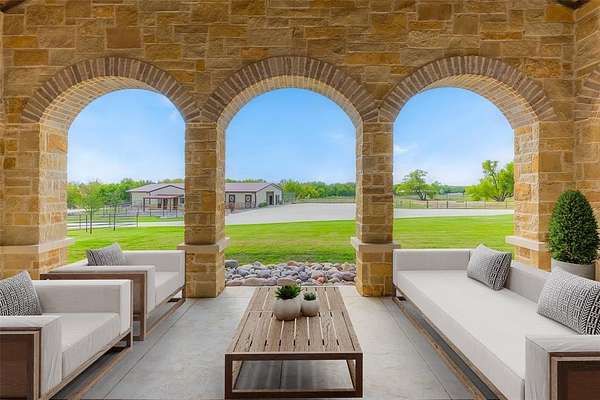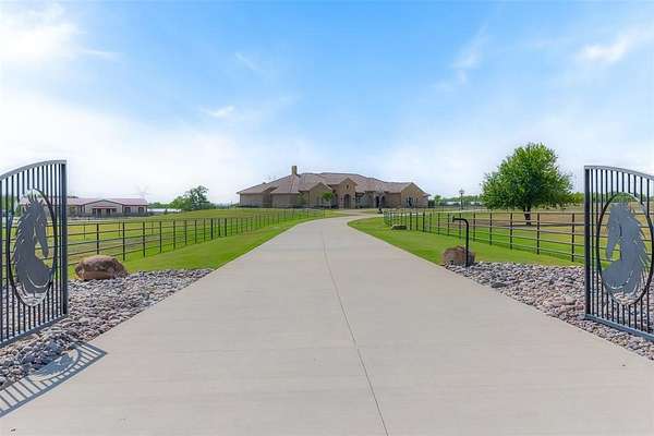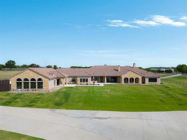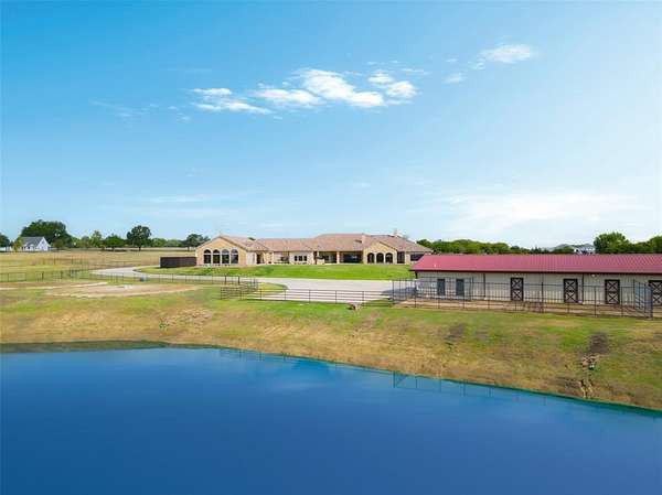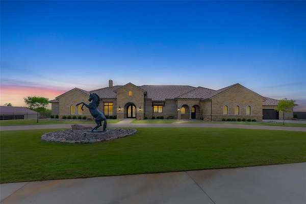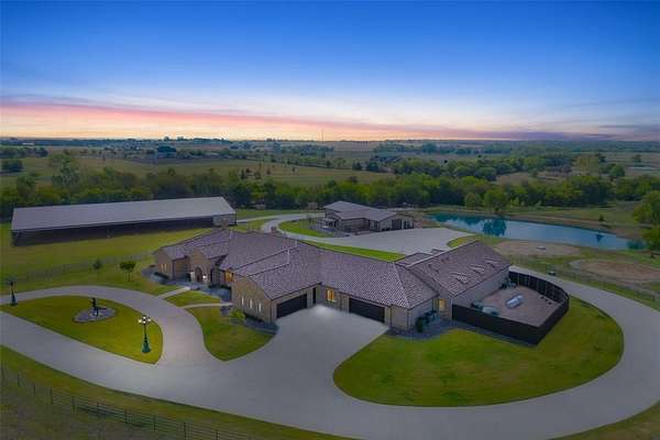 Country oasis within an hour from Downtown Dallas Texas on 25 manicured acres. Property features timeless Mediterranean masterpiece boasting fine finishes and attention to detail throughout. Open living spaces flow seamlessly together offering endless entertaining opportunities. Expansive master suite offering oversized custom walk-in closets, fireplace, coffee bar, soaking tub. Single story home offering 5 bedrooms, library and indoor pool. Gourmet kitchen with Thermador appliances opens to dining and outdoor living. For the equestrian 20,000 square foot indoor riding arena and 9 stall barn steps from the back door. Stunning horse stables offers one bedroom apartment, separate lounge and half bath, tack room, storage area and runs off stalls. Arena offers Kiser dirt and viewing area. Guest home with private entrance. Country living with city conveniences. Ag exempt offering lower property taxes.