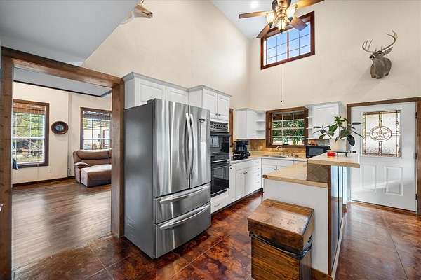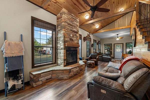 Welcome to this beautifully unique 2-bedroom, 2.5-bath barndomium that offers space, comfort, and versatility -- just minutes from the lake! Perfectly suited for those who love a blend of rustic charm and modern amenities, this property has it all. Inside, you'll find rich pine floors throughout and a welcoming gas and wood-burning fireplace as the centerpiece of the living room. An elegant winding staircase leads to a loft-style upstairs bedroom and full bath, overlooking the living area -- ideal for guests, teens, or a private retreat. The primary suite boasts his and hers walk-in closets and a spacious en-suite bath. Each bedroom is generously sized, and all bathrooms are thoughtfully designed for comfort and functionality. Step outside to enjoy the covered front porch, perfect for relaxing year-round. Cool off in the above ground pool and take advantage of the electric gate for added privacy and security. Equestrian or hobby farm ready, the property includes a walking pen approved for FHA, a feed shack, and ample space for animals. RV owners will appreciate the RV hookup, and guests will feel right at home in the detached garage with a fully equipped mother-in-law suite with additional 442 square foot 1 bedroom, and 1 bath with adorable porch overlooking lake which offers both comfort and privacy. Whether you're looking for a full-time residence or a weekend getaway near the lake, this property is a rare find with unmatched character and functionality. It would also be a great Airbnb. Schedule your private showing today and experience all this charming property has to offer!