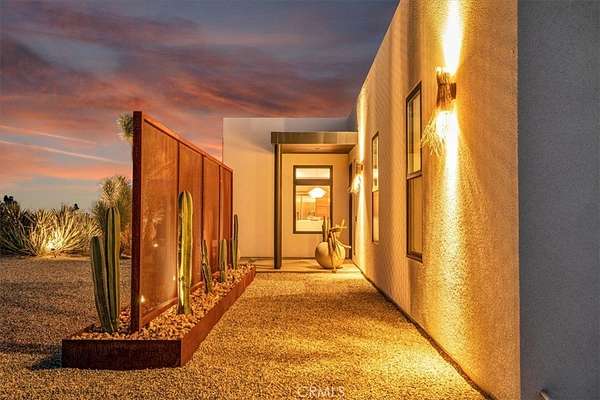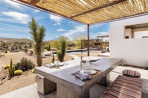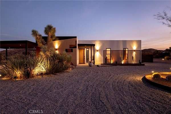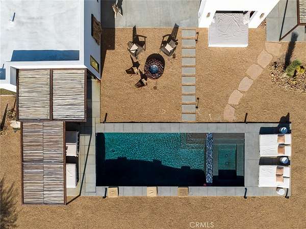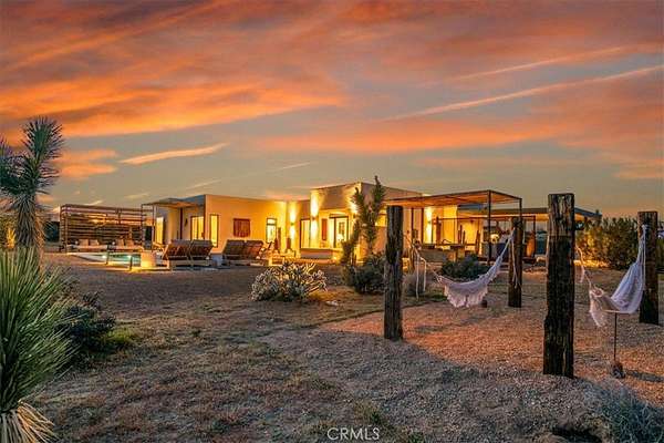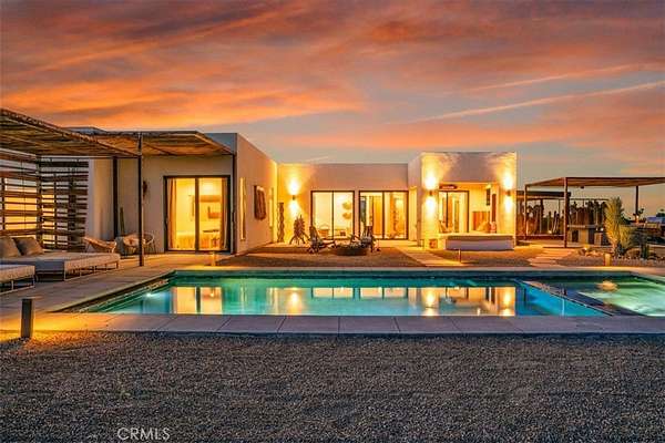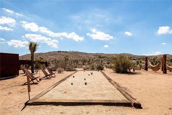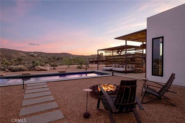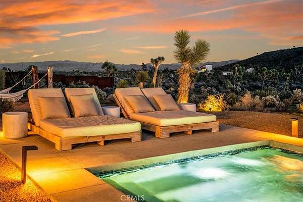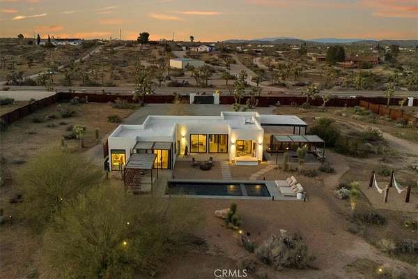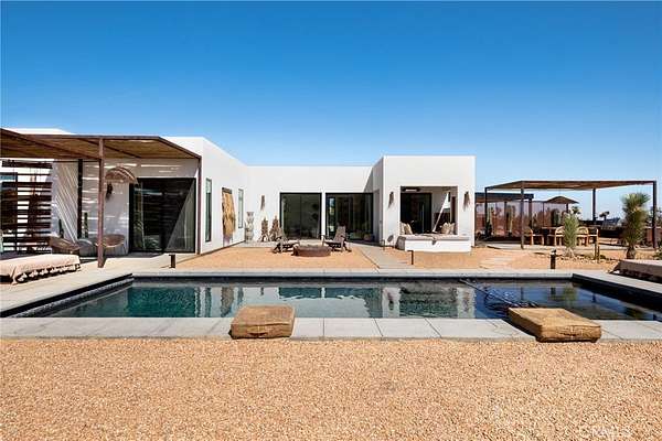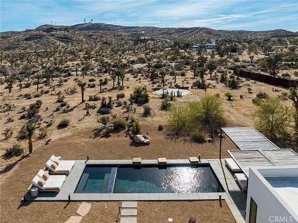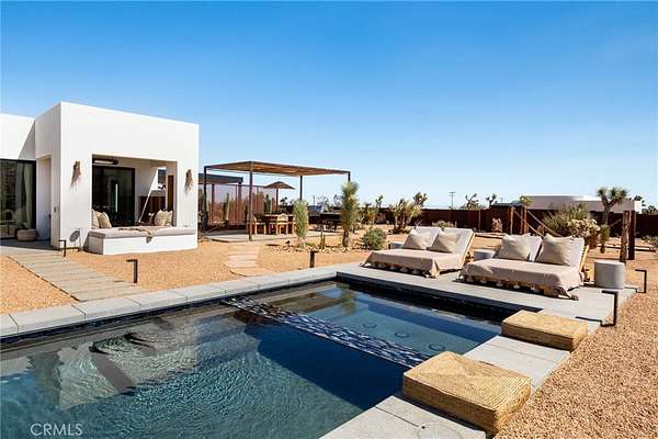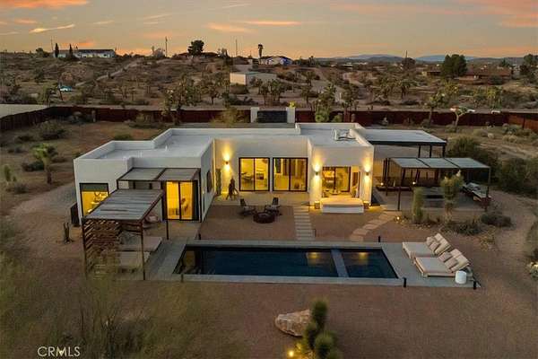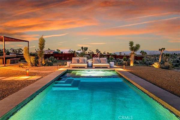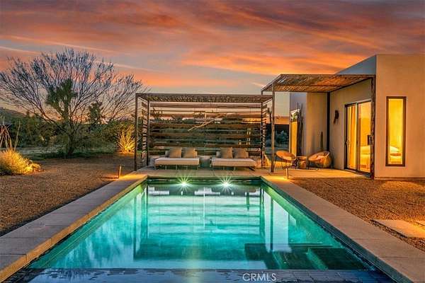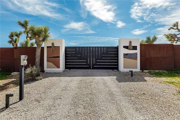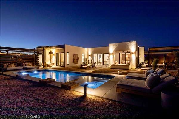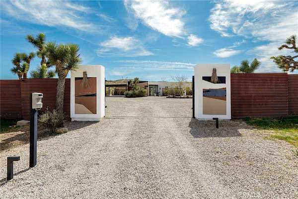 Set on 2.30 private acres in Yucca Valley, this stunning organic modern retreat blends contemporary design with the serenity of the high desert. Built in 2020, the thoughtfully designed home offers 2 bedrooms, 2 bathrooms, and 1,363 square feet of stylish living space and has proven itself as a successful vacation rental. Inside, clean architectural lines and warm modern finishes create a welcoming, design-forward atmosphere that seamlessly connects indoor and outdoor living. The outdoor spaces are designed for relaxation and entertaining, featuring a resort-style in-ground pool and spa, expansive lounge areas, and beautifully lush desert landscaping. A dedicated yoga circle offers the perfect setting for morning meditation, while a bocce ball court adds a playful element for guests and gatherings. A private entry gate enhances the sense of seclusion while still offering a convenient location just minutes from downtown Joshua Tree and Joshua Tree National Park. Whether used as a personal desert escape or continued as a high-performing short-term rental, this property delivers the ultimate blend of modern design, privacy, and resort-style outdoor living in the heart of the high desert.