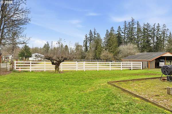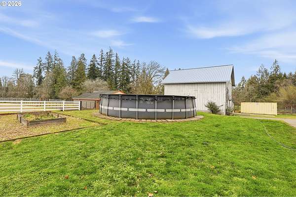 - Above Ground Pool, Barn, Corral, Cross Fenced, Gas Hookup, Raised Beds, Yard