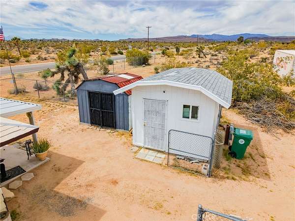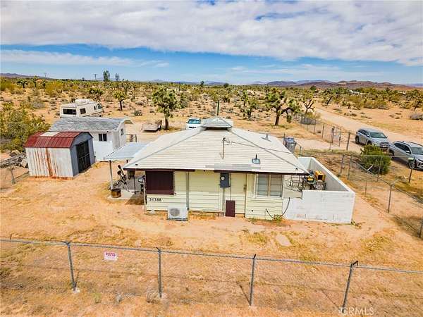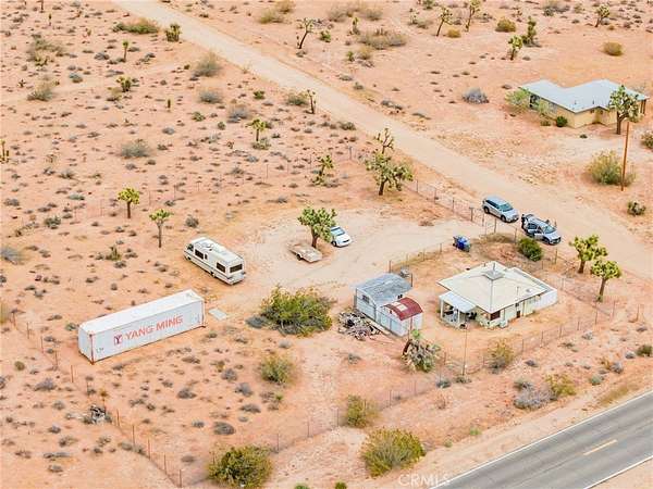 YOUR DESERT DREAM AWAITI DISCOVER 9 ACRES OF SPACE, SERENITY, AND ENDLESS POSSIBILITIES. BUILD YOUR DREAM HOME, INVEST, OR CREATE YOUR PRIVATE RETREAT WITH BREATHTAKING DESERT AND MOUNTAIN VIEWS. YOU ARE ABLE TO PURCHASE 3 PARCELS OF LAND TOGETHER. FLAT BUILDABLE LAND. #1 PARCEL IS THE MAIN HOUSE 1BD 3/4 BA. HOUSE. FULL/KITCHEN WITH REFRIGERATOR, BUILDED IN DOUBLE OVEN, DISH WASHER. THE LIVING AREA HAS TILE FLOORS, HIGH CEILING THROUGH OUT THE HOUSE. IT ALSO COMES WITH A WASHER & DRYER IN THE LAUNDRY ROOM ON THE SIDE OF THE HOUSE. A MINI SPLIT HEATING/COOLING SYSTEM. IT ALSO HAS 2 STORAGE SHED OUTSIDE, AND A 40 FT CARGO CONTAINER. THE PROPERTY IS FENCED IN WITH DOUBLE GATES. PARTIAL PARTIAL IMAINS 1.8 AC. FLAT BBUILDABLE LAND NEXT DOOR, NORTH OF THE MAIN HOUSEON HARMONY RD. #3 PARTIAL SITS ON 3.6 AC. OF FLAT BUILDABLE LAND WITH A CABIN 216 AC. WEST OF THE MAIN HOUSE ON THE CORNER OF ABERDEEN DR. & LA HARBA AVE, GREAT VIEW