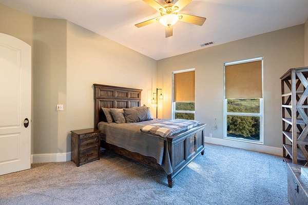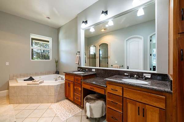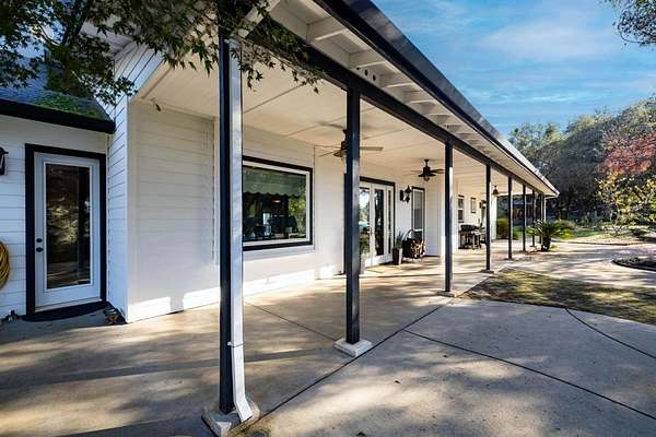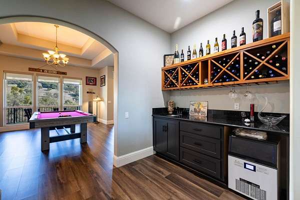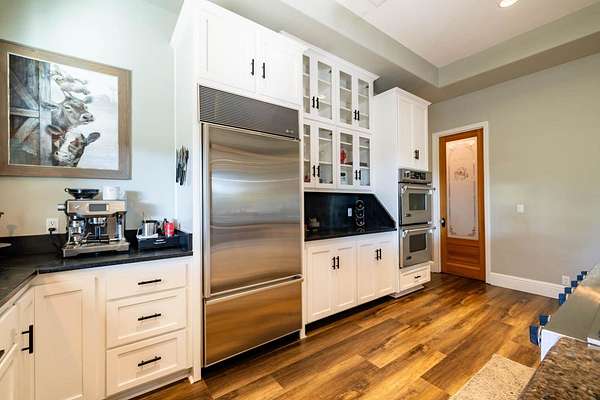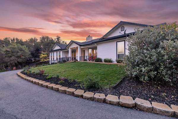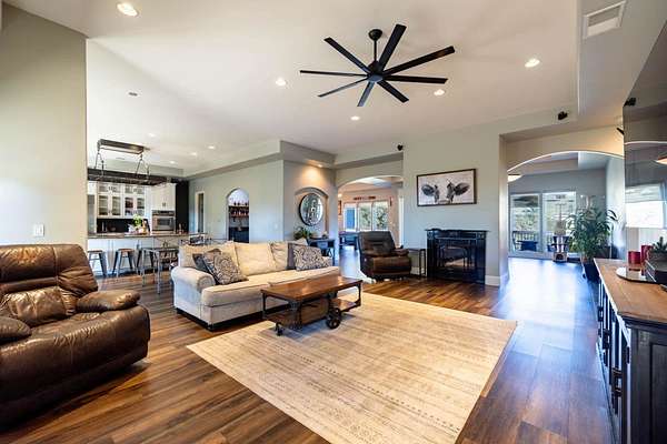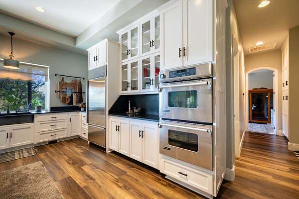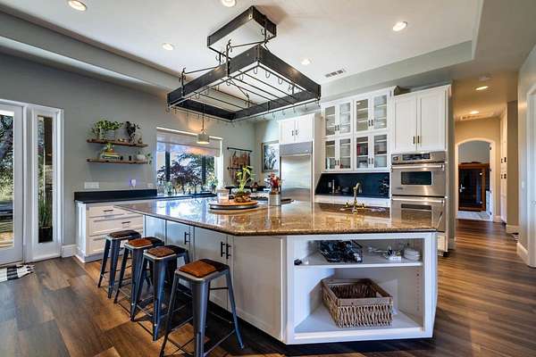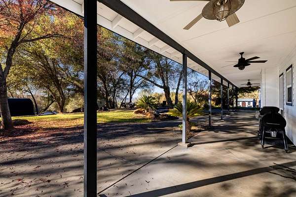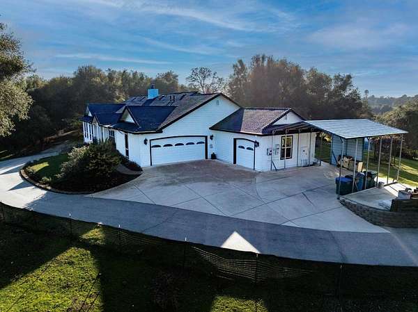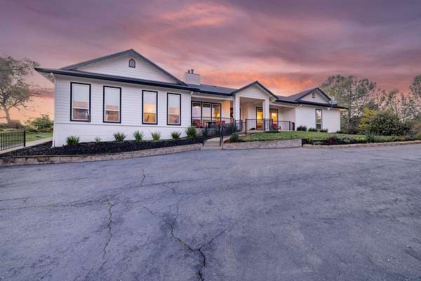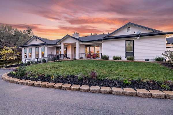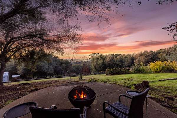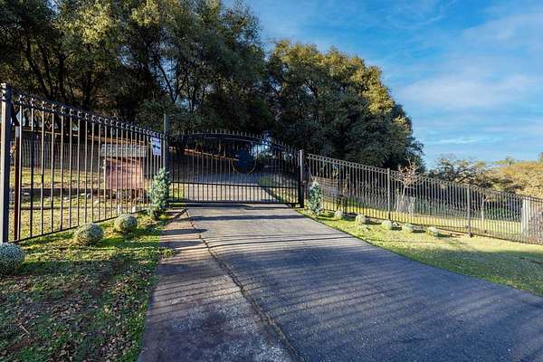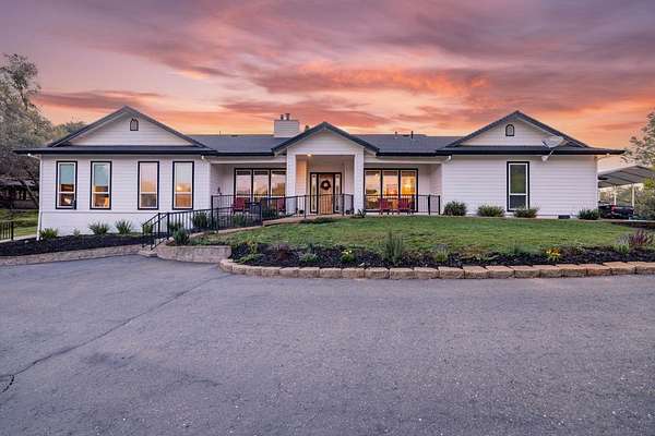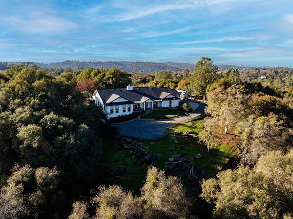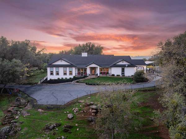 Discover an exceptional retreat just far enough from the city to feel private while offering the comfort and refinement expected in a luxury estate. This single story custom home sits on 10 fully fenced acres behind an automatic gate and showcases rolling hills, a seasonal pond, and stunning long range views. The surrounding land is just as extraordinary as the residence, creating a rare blend of natural beauty, privacy, and everyday livability. Inside, tall ceilings, stone countertops, and eight foot arched doors create an elevated feel throughout. The gourmet kitchen includes Jenn Air double ovens, a six burner gas stove, Sub Zero refrigerator and freezer, and a large walk in pantry, making it ideal for cooking, hosting, and everyday convenience. A bar and wine area with built in fridges enhances entertaining. The primary suite features a sitting area, patio access, a spa inspired bath, and a spacious walk in closet. Additional highlights include a cozy wood burning stove area, a whole home water filtration system, and a large indoor laundry room. Outside, the property offers versatile outbuildings, an oversized three car garage with built ins, covered RV or boat parking, and an expansive covered patio designed for relaxing and enjoying the peaceful views.