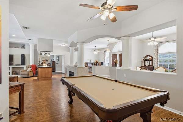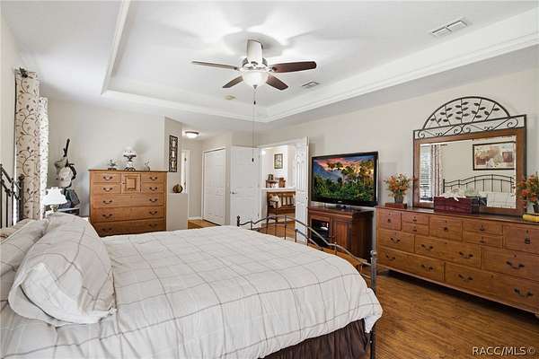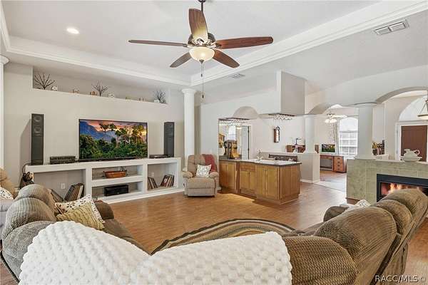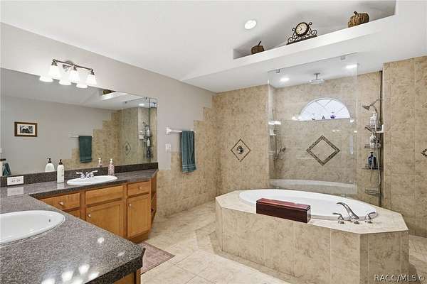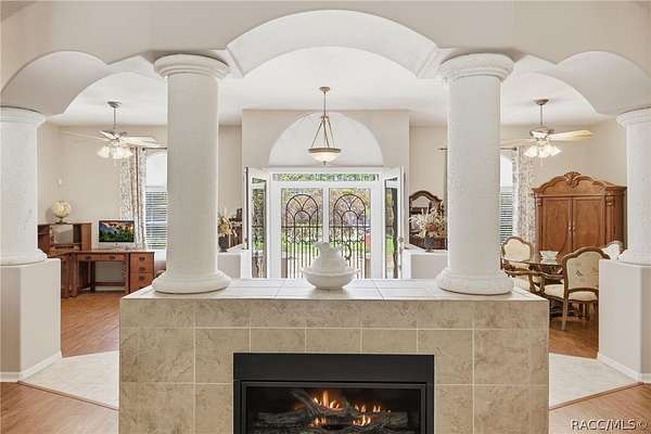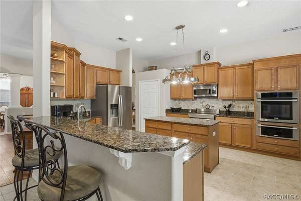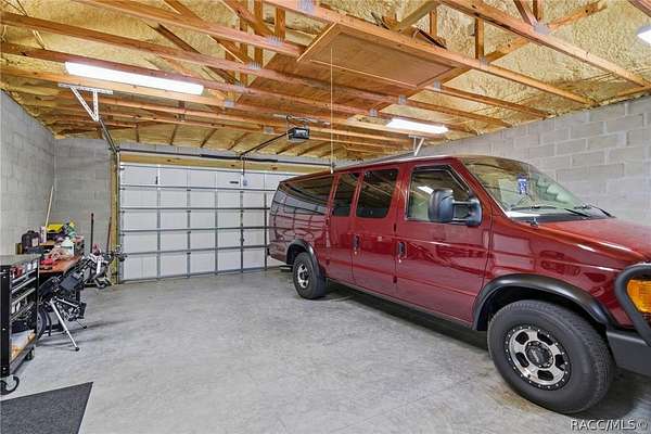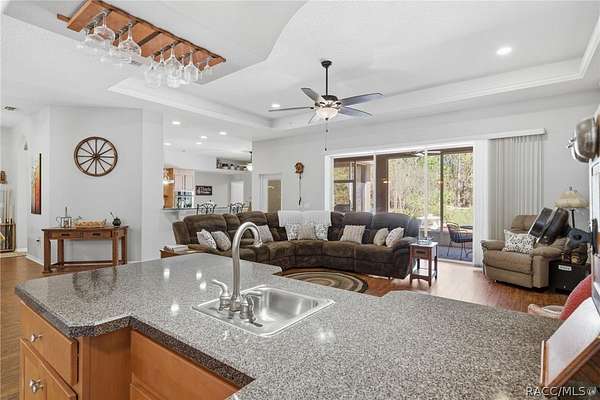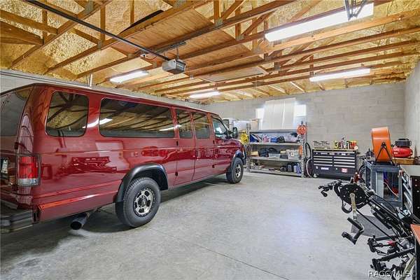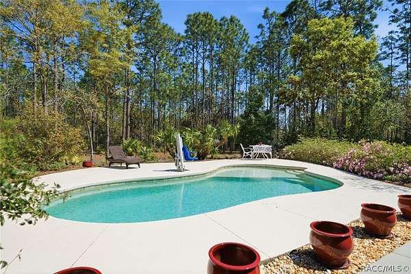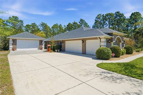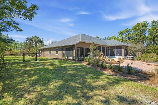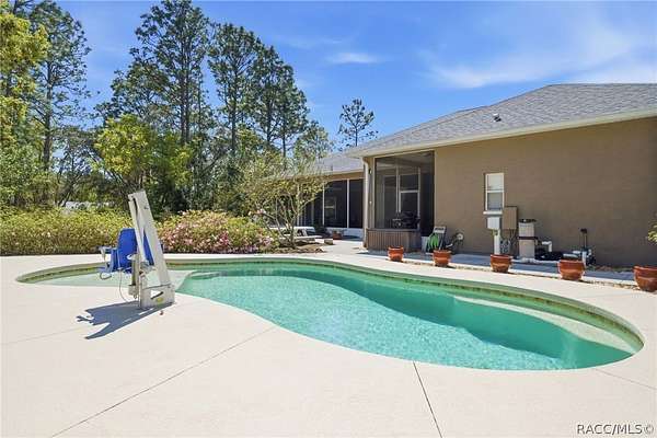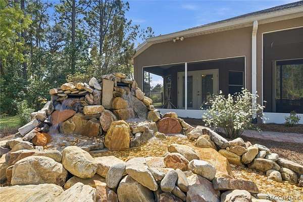Your buying habits follow an obvious pattern, you simply want the best of everything! This flagship model home was the builder's model home and offers a ton of features you won't find in most resales. From pavers at the front door entry and lanai to beautiful wood cabinets and very stylish Electrolux kitchen appliances with multiple ovens, it's all here on the inside! And outside - whoa! An amazing rock waterfall cascading in the moonlight while everyone gathers around the fire pit on the paver patio for a memorable experience. The next water feature is a pool added in 2015. It is not caged and naturally warmed by the Florida sun. The pool has a chair lift for disabled persons, and this entire home is barrier free and qualifies for VA financing for qualified veterans. The detached monster garage (24x30 ft) even has its own A/C for comfort not to mention a 7x8 covered breezeway to enter the house through the rear bedroom turned man cave! This room can be closed off to the rest of the house with a pocket door and have a mini suite with full shower only bathroom and an exit to the lanai. Kitchen privileges TBD! Down the hall is another guest bedroom, bath and 3rd bedroom currently being used for home gym. The primary bedroom has a sitting area with French doors (an owner enhancement not usually found in this model) to the lanai, dual closets, dual sinks and dual shower entrances! Pamper yourself in spa-like comfort! And of course, the family room is an open concept space connecting the kitchen, lanai, and formal spaces. A Generac generator assures your comfort during power outages and has a buried propane tank that is owned so you can buy propane from whomever you choose. The roof was replaced in March 2022, and a mini-split unit was added to the man-cave in 2023. And, if all of that really isn't enough to engage your spending neurons then let me add in the back acre so that no one will ever interrupt your serenity. The immediate backyard is fully fenced with multiple gates and concrete/paver sidewalks for easy maneuverability. Plus, a 12x24 shed with ramp for yard and garden supplies. It's all here! Where are you and why are you still there?