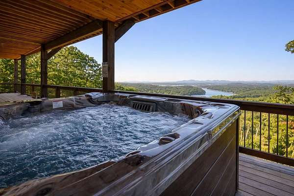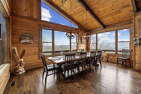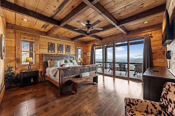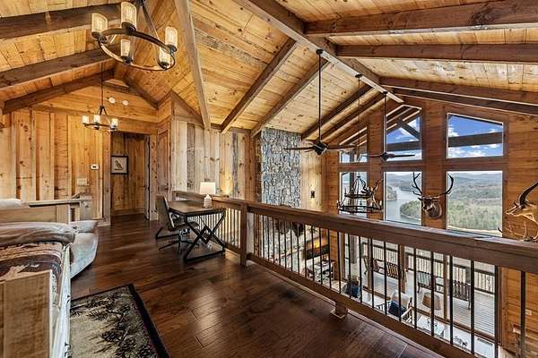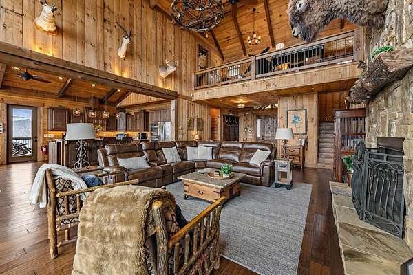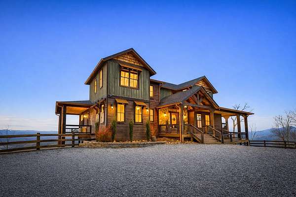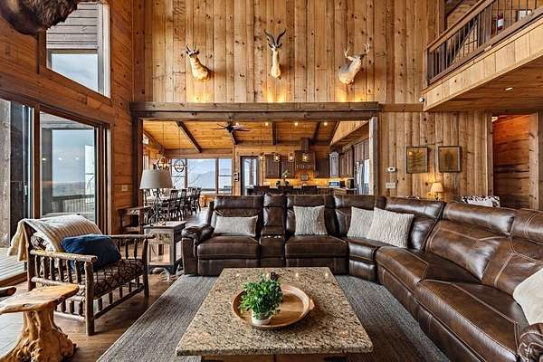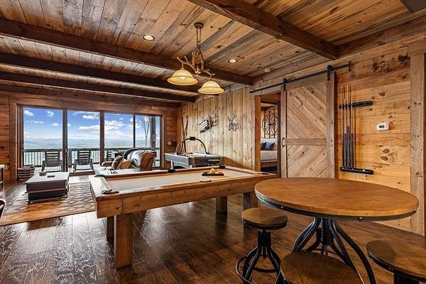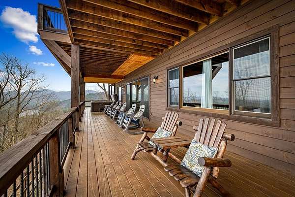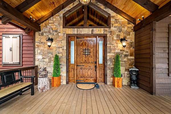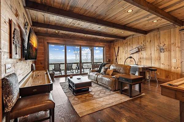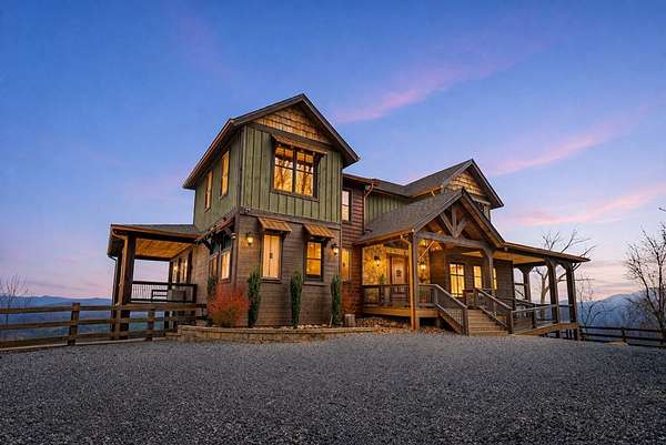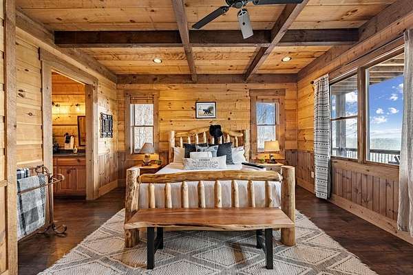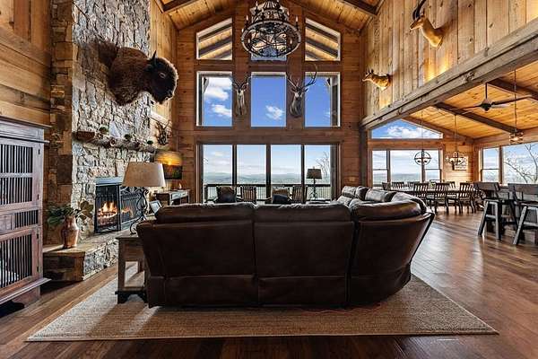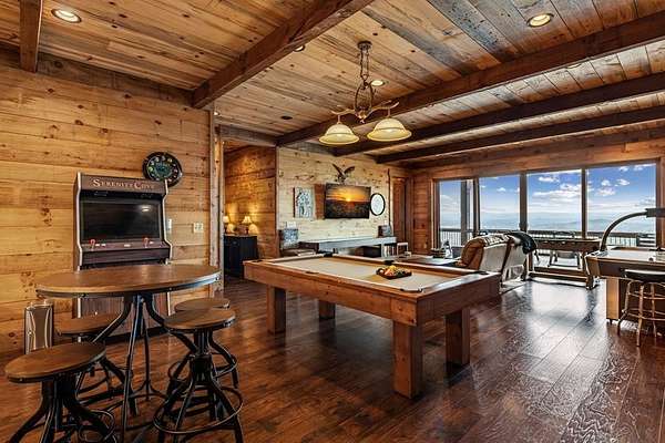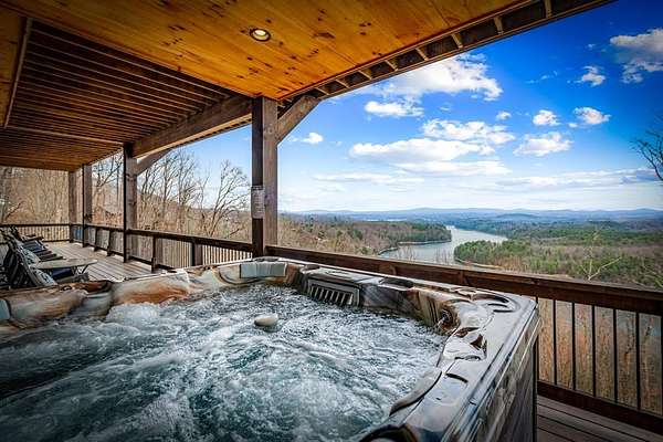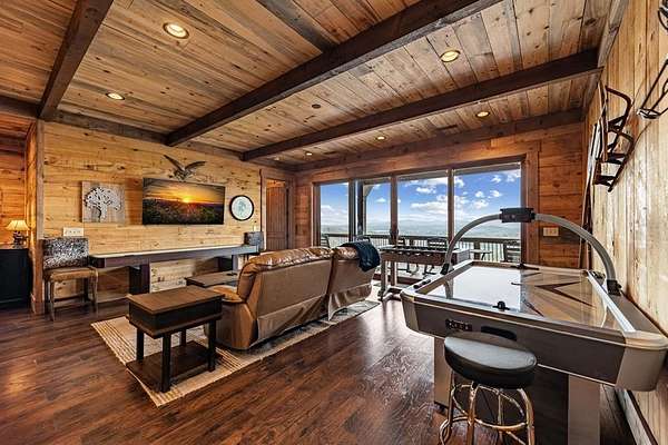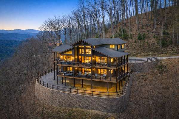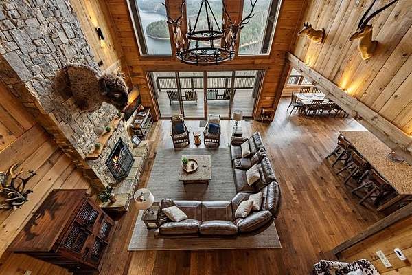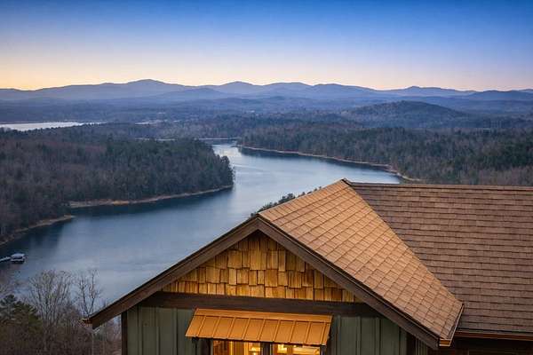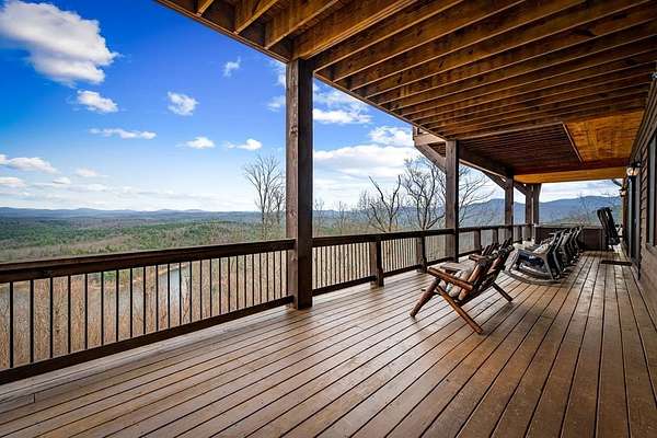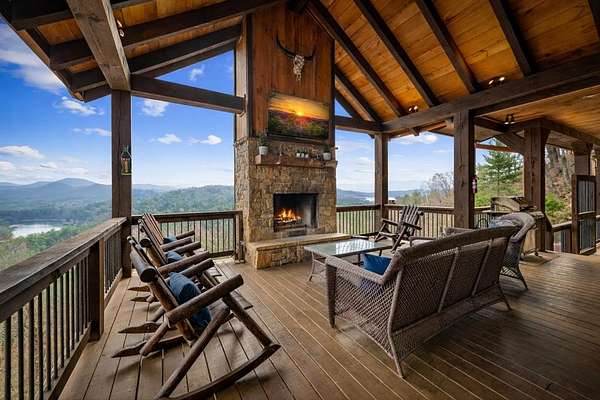 Ultimate Luxury and Ultimate Privacy | Mountain Top Retreat Overlooking Lake Blue Ridge + Borders National Forest only 10 Minutes from Blue Ridge! First time on the market! As seen on American Dream Home on Fox Business, Serenity Cove offers a rare combination of privacy, breathtaking scenery, and refined mountain living. Tucked within the coveted Aska Adventure Area on a quiet cul-de-sac, at the top of the highly sought after Necowa Cove community, this extraordinary cabin delivers sweeping long-range views that extend across Georgia into North Carolina and Tennessee—creating a truly unforgettable backdrop in every season. Designed as the ultimate retreat for large gatherings, the residence features an expansive, thoughtfully designed floorplan with seven bedrooms, including five king suites with private en-suite baths. Two luxurious primary suites on the main level offer spa-like bathrooms and serene views, while additional guest accommodations—featuring a mix of king and twin sleeping arrangements—ensure comfort, flexibility, and privacy for family and guests alike. The main living area is a showpiece of mountain elegance, with soaring vaulted ceilings, walls of glass framing panoramic vistas, and a seamless flow between indoor and outdoor living spaces. A chef's kitchen anchors the home, equipped with premium appliances, oversized island, double ovens, and generous dining space designed to comfortably host large groups. Step outside to expansive wrap-around decks and covered entertaining areas, complete with a wood-burning fireplace, outdoor seating, and grilling station—ideal for year-round enjoyment. A lower-level terrace offers a private hot tub and additional lounging areas, all positioned to take in the spectacular lake and mountain views. Entertainment and recreation abound throughout the home, including a fully equipped game room with pool table, shuffleboard, arcade games, and a wet bar—perfect for hosting unforgettable gatherings. Located just min