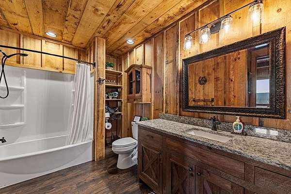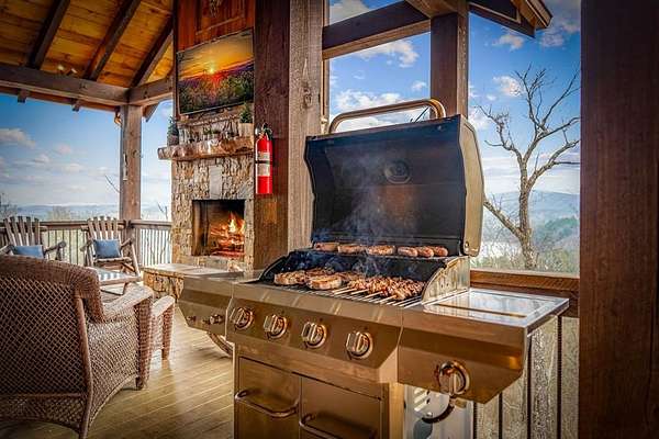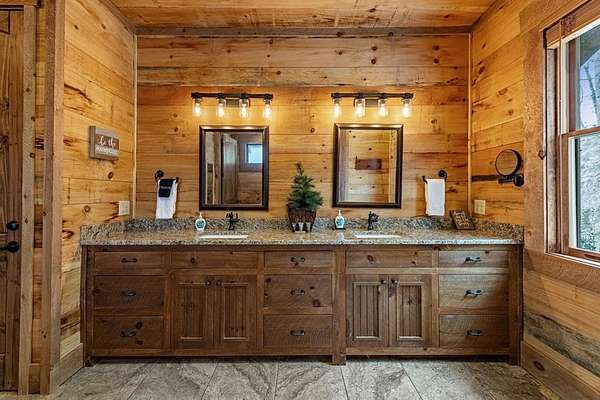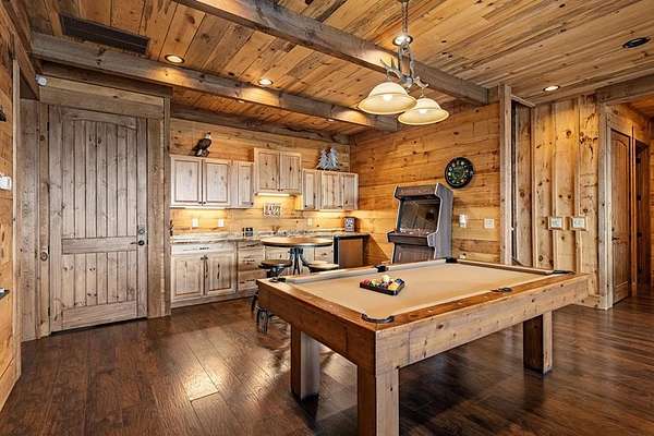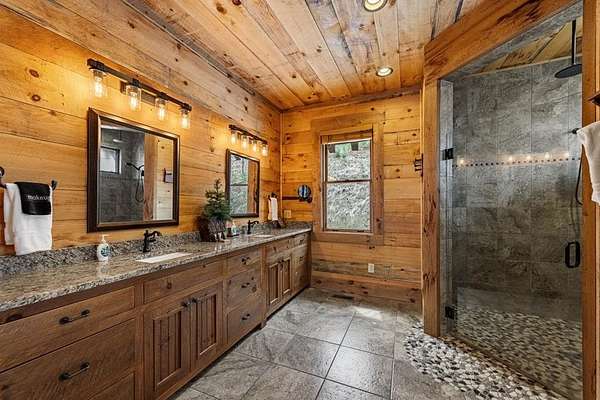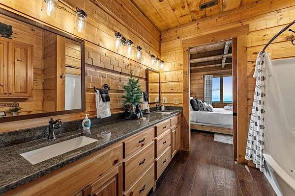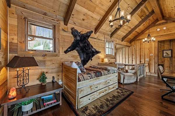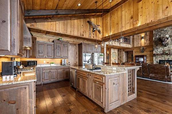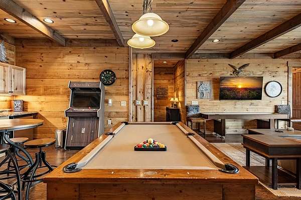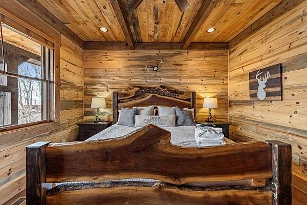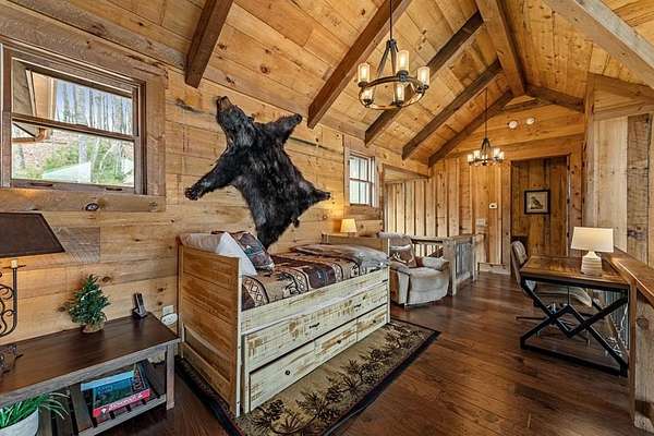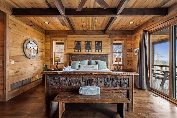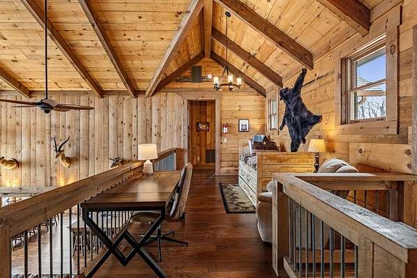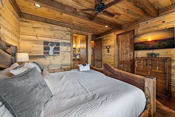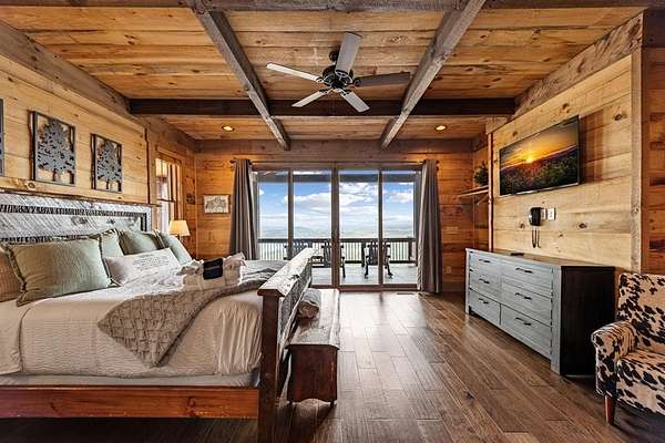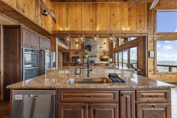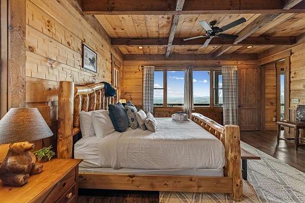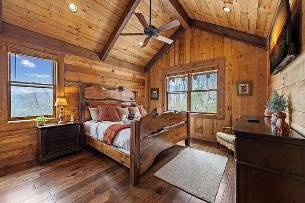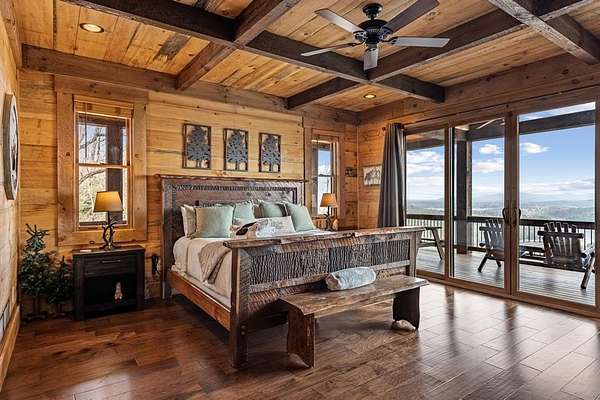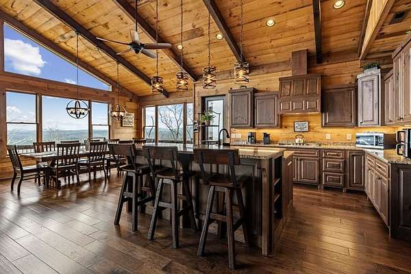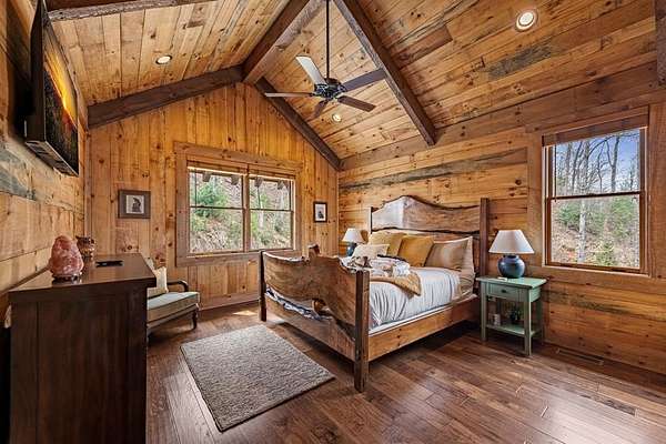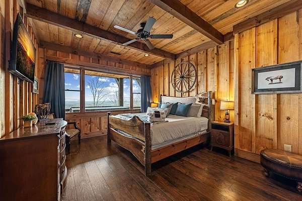 Ultimate Luxury and Ultimate Privacy | Mountain Top Retreat Overlooking Lake Blue Ridge + Borders National Forest only 10 Minutes from Blue Ridge! First time on the market! As seen on American Dream Home on Fox Business, Serenity Cove offers a rare combination of privacy, breathtaking scenery, and refined mountain living. Tucked within the coveted Aska Adventure Area on a quiet cul-de-sac, at the top of the highly sought after Necowa Cove community, this extraordinary cabin delivers sweeping long-range views that extend across Georgia into North Carolina and Tennessee—creating a truly unforgettable backdrop in every season. Designed as the ultimate retreat for large gatherings, the residence features an expansive, thoughtfully designed floorplan with seven bedrooms, including five king suites with private en-suite baths. Two luxurious primary suites on the main level offer spa-like bathrooms and serene views, while additional guest accommodations—featuring a mix of king and twin sleeping arrangements—ensure comfort, flexibility, and privacy for family and guests alike. The main living area is a showpiece of mountain elegance, with soaring vaulted ceilings, walls of glass framing panoramic vistas, and a seamless flow between indoor and outdoor living spaces. A chef's kitchen anchors the home, equipped with premium appliances, oversized island, double ovens, and generous dining space designed to comfortably host large groups. Step outside to expansive wrap-around decks and covered entertaining areas, complete with a wood-burning fireplace, outdoor seating, and grilling station—ideal for year-round enjoyment. A lower-level terrace offers a private hot tub and additional lounging areas, all positioned to take in the spectacular lake and mountain views. Entertainment and recreation abound throughout the home, including a fully equipped game room with pool table, shuffleboard, arcade games, and a wet bar—perfect for hosting unforgettable gatherings. Located just min