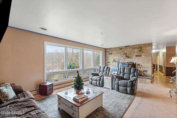 Spacious ranch-style home situated on the outskirts of Lewisburg in East Buffalo Township, offering privacy, functionality, and room to grow. Set on a generous 1.55-acre lot fully enclosed with white fencing, this property features two convenient access points--directly off Route 15 South or via Pine Ridge Road.Inside, the home offers four nicely sized bedrooms and beautiful oak hardwood flooring throughout most of the main living areas. The layout includes a functional kitchen with granite countertops, a well-sized dining room, and a large living area with scenic sunrise views. A coal stove provides an additional heating source, complementing the home's three heating systems, which include a heat pump with central air and a newly replaced oil burner.