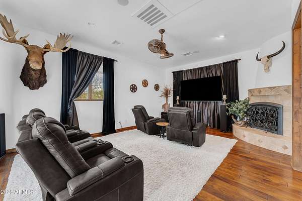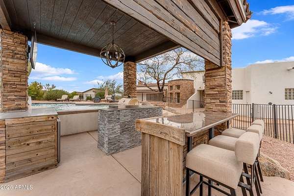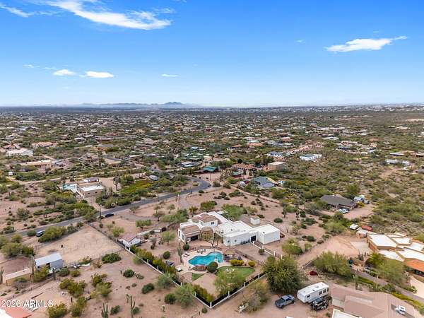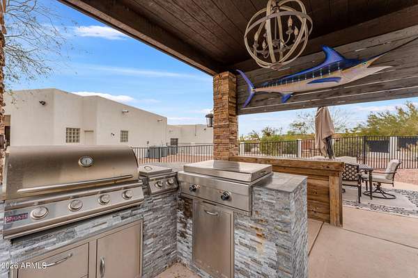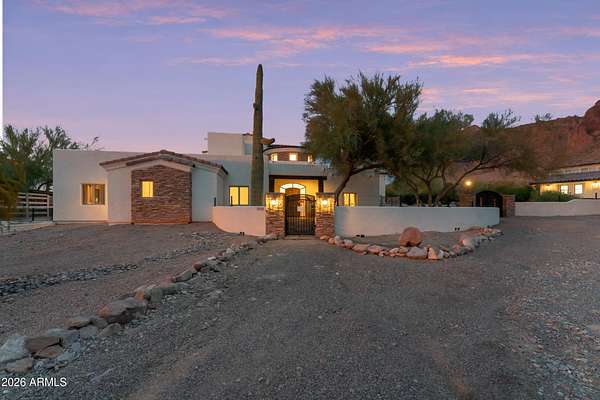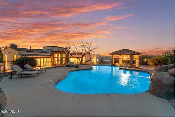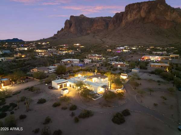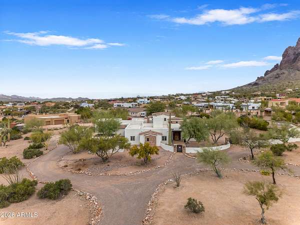 Luxury home w/pool, waterslide, rooftop deck and 5-car garage at the base of the Superstition Mountains. This 4 bed, 5.5 bath executive estate offers 5,300+ sq ft on a 108,956 sq ft lot with stunning 270-degree mountain and city light views. Updated chef's kitchen with Wolf double ovens, Viking induction cooktop, wine fridge and custom hood. Master bath updated with steam shower, double vanities, tub & two-sided fireplace. Other rooms include: office (or 5th bed), movie theater, gym and separate gaming/casita room. Resort-style backyard features outdoor shower, swim-up bar, outdoor kitchen with BBQ & Hibachi. Expansive garage w/extra storage. Desert living designed for entertaining and elevated everyday comfort. Stunning views. Short term rental opportunities. Generator does not convey.