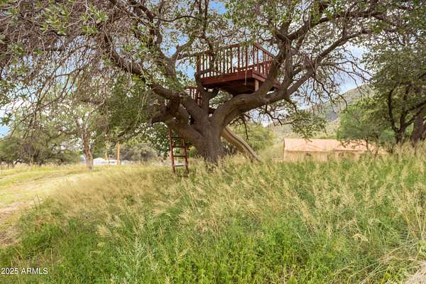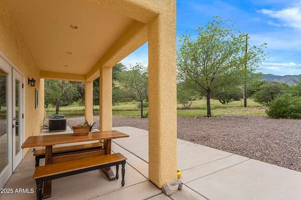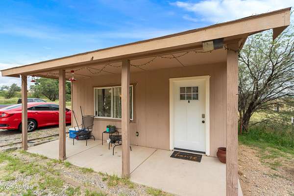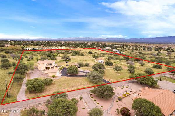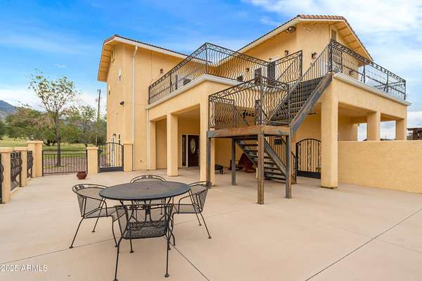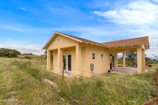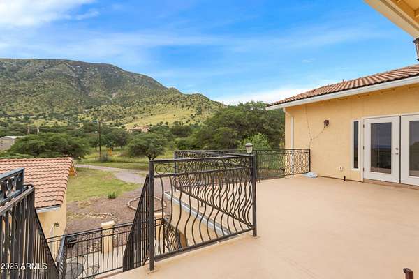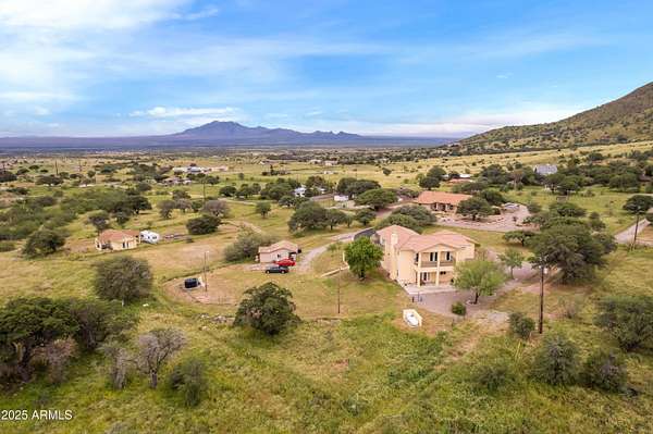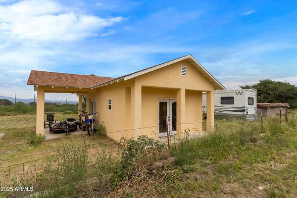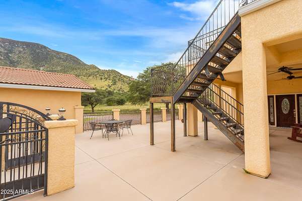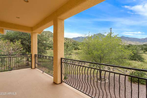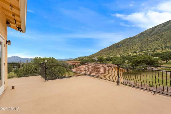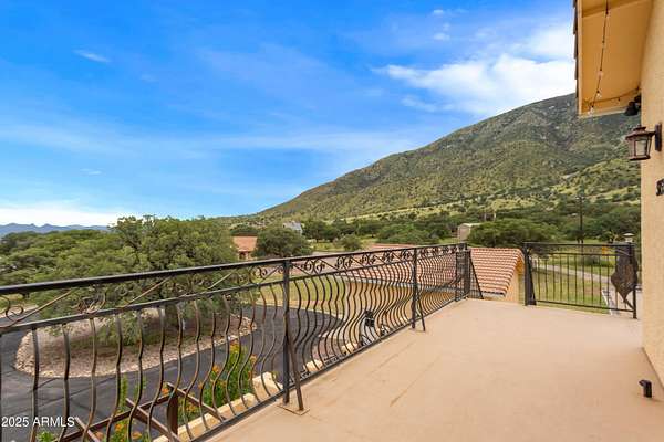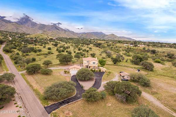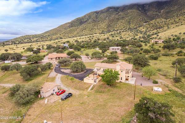 This truly unique home offers 2595 sq. ft. with 4 bedrooms and 2.5 bathrooms in the main residence. The open kitchen flows into a warm and inviting living space, centered around a gorgeous stone wood-burning fireplace. The primary suite is located on the main floor, while a stunning custom staircase leads to a spacious loft with family room and bar, the ultimate space for entertaining or relaxing. Upstairs, you'll find 3 bedrooms and a full bathroom, each with direct access to the nearly wraparound patio where you can soak in the incredible views of the historic Our Lady of Sierras Shrine. The property also includes a private guest quarter, 374 sq ft with a full bathroom ideal for extended family or visitors. There is also a full workshop equipped with electrical, water and covered patio that could easily be converted into another guest house or studio. All of this sits on nearly 10 acres of land, (two parcels being sold together). The main property features its own private well, while the adjoining property offers a two-part well share, providing flexibility and peace of mind. This is more than a home...it's a rare opportunity to own a private retreat in Hereford, AZ, with space, views, and endless potential.