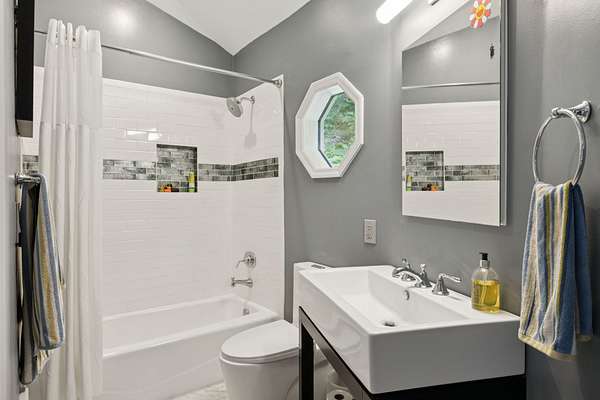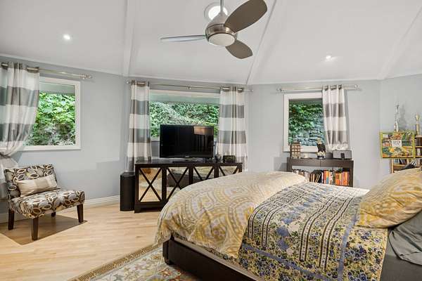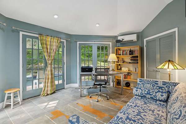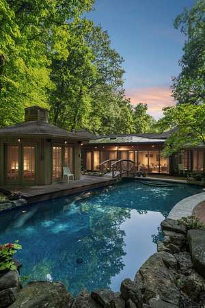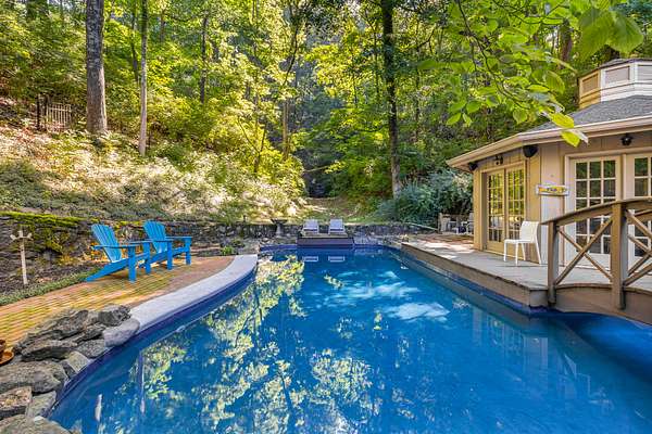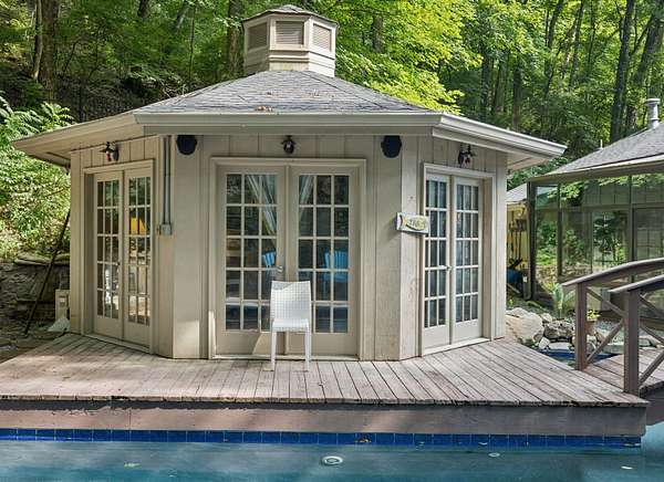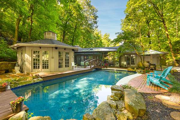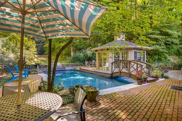 Outdoors, an inground pool sits tucked away and hidden by the surrounding woods, providing complete privacy. Pool upgrades in 2023 include new gunite and concrete coping. A wooden bridge leads to a 12-sided detached pool house, fully remodeled in 2021. With its own HVAC and full bath, it's perfect as a guest suite, studio, home office, or play space. Note: 300 SqFt listed as 2nd story is actually detached Pool House/office with full bath.
