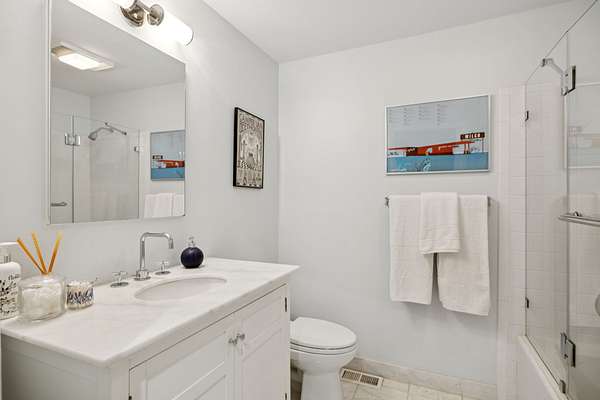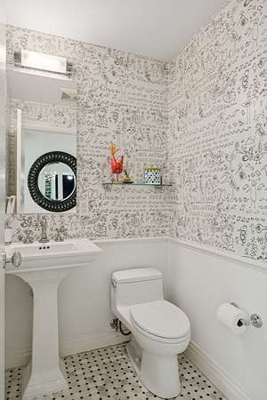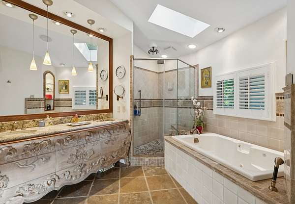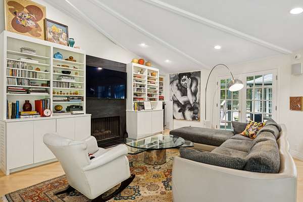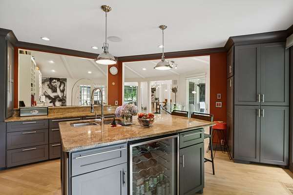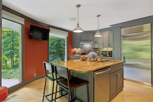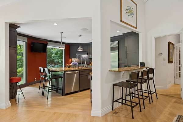 Features include custom built-ins in the living room, primary suite, and secondary bedrooms. The chef's kitchen boasts a Viking gas range, Sub-Zero refrigerator, wine refrigerator, custom cabinetry, granite countertops, and center island. The laundry room, which doubles as a craft studio, includes heated floors, custom storage, and a utility sink.