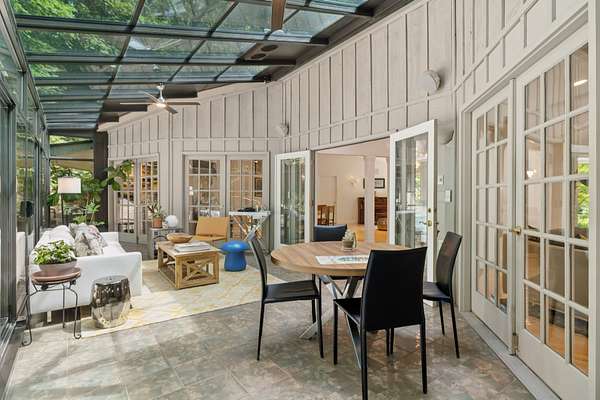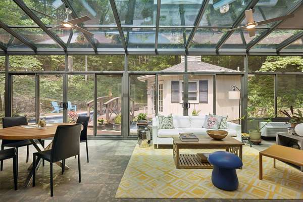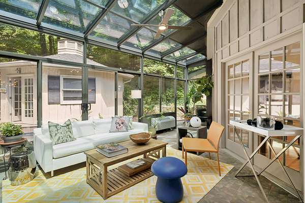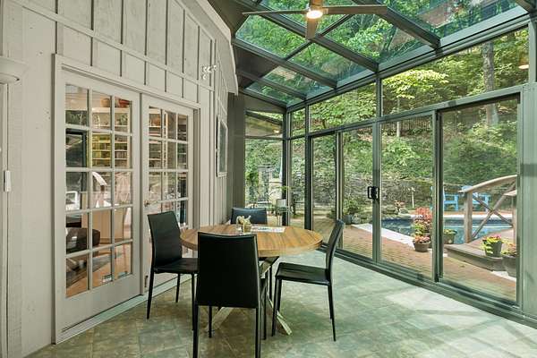 All three bedrooms have en-suite baths. The primary bath features a granite-topped vanity, whirlpool tub, and glass-enclosed shower. Floors are beautiful white maple hardwood with walnut accents in the foyer. The 34x12 solarium is the home's true showpiece--a four-season room wrapped in floor-to-ceiling glass, offering a serene, treehouse-like experience to enjoy morning coffee or the changing seasons.