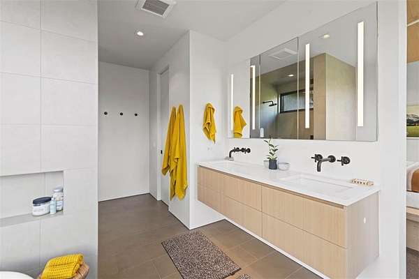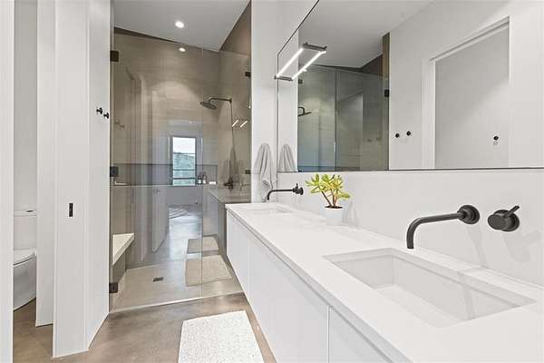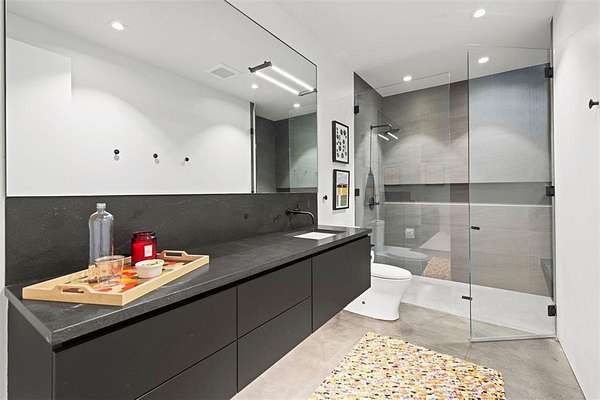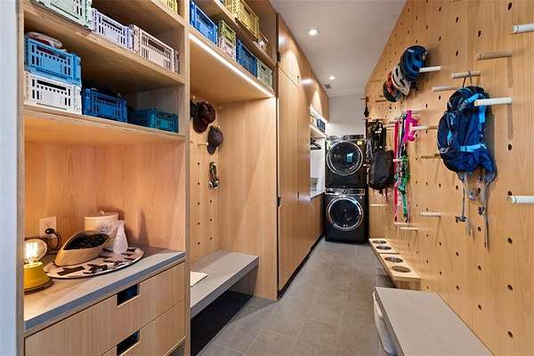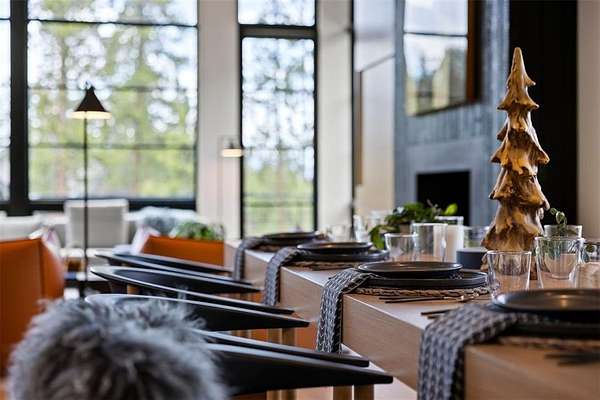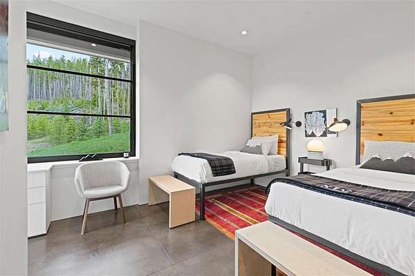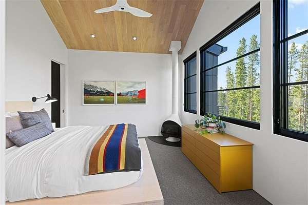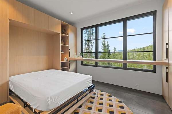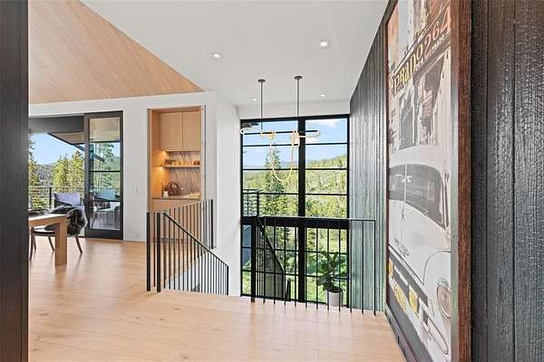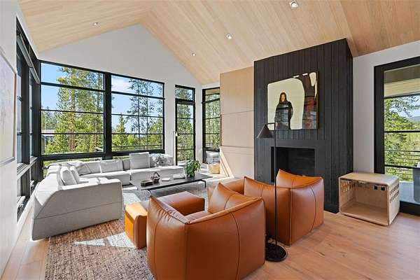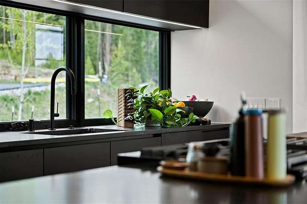 With interiors by Studio B of Aspen, the home embodies restrained yet elevated design, from the dramatic Shou Sugi Ban black-burnt wood entry to breathtaking vistas that extend fluidly throughout each space. Floor-to-ceiling windows bathe the spaces in natural daylight, reinforcing a seamless connection between inside and out. A calm palette of white walls and bespoke English white oak floors sets a luminous, elegant and inviting tone. Museum-quality walls offer the perfect canvas for showcasing a collector's art, while fine architectural details reflect a dedication to craftsmanship. Anchoring the kitchen is a sculptural, black island topped with honed quartzite--bold and moody. This singular design element echoes the exterior and draws the eye as a natural gathering point. An integrated appliance package makes the space as functional as it is beautiful, including a crisp, white built-in Miele coffee system. Thoughtful lighting from Nordic-inspired pendants to integrated wall and millwork illumination evokes both drama and softness. Affectionately nicknamed the "Scandie Modern Snow Globe" by the owners, this mountain haven offers tranquil wildlife views from nearly every room--an idyllic nature retreat.