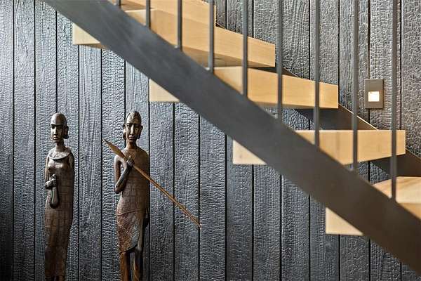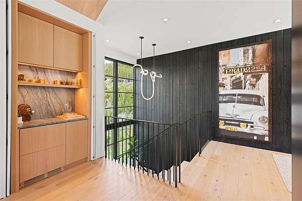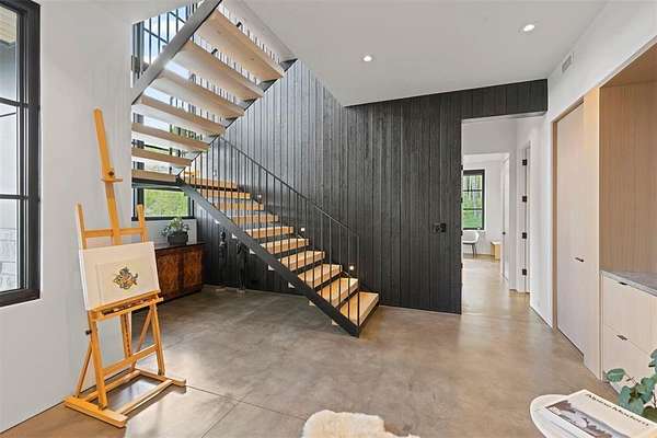 An exquisitely detailed staircase connects the levels, exemplifying the custom construction that elevates this property far beyond conventional.
