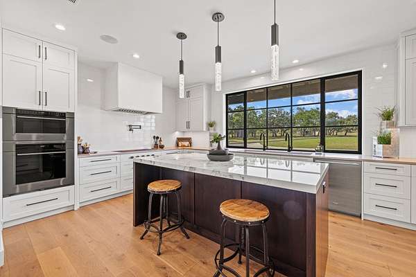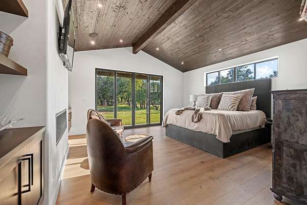 At the gateway to one of Texas' most iconic landscapes, Enchanted Rock Ranch offers 36+/- acres of rolling Hill Country terrain directly across from Enchanted Rock State Natural Area. Enjoy front-row sunset views over the famed pink granite dome, with immediate access to hiking, climbing, wildlife, and soon-to-expand parkland. Just 20 miles from Fredericksburg and 90 miles from Austin and San Antonio, this property pairs privacy with convenience. Seller financing negotiable. The land is a balanced blend of open pasture and wooded creek bottom, highlighted by 685+/- feet of Keener Branch Creek and a scenic 0.25-acre lined tank with fishing dock. Approximately 20 acres of mature hardwoods provide habitat for whitetail, axis, turkey, dove, and ducks. Sixteen acres are high-fenced, with the remainder low-fenced. An agricultural valuation is in place and could transition to wildlife management. Irrigation lines in the front pasture offer vineyard or orchard potential, while granite outcroppings and hardwoods create additional homesite opportunities. Completed in 2020, the ~4,000 SF custom residence by Nadeau Architecture and built by Bill Dunn blends timeless design with modern finishes. The 3BR/3.5BA layout features two ensuite bedrooms downstairs, an upstairs guest suite, office, den, and formal living with built-in surround sound. The chef's kitchen includes Wolf, Sub-Zero, and Cove appliances, custom cabinetry, quartz counters, and a large island. The primary suite showcases a fireplace, spa-inspired bath with Kohler Stargaze air tub, and expansive Hill Country views. A screened porch overlooks a prime pool site. Two active wells (plus a third drilled) support the improvements. The 12,300 SF clear-span covered arena offers unmatched versatility-ideal for equestrian use, workshop, event venue, or expanded living. Six 12x12 stalls, tack room, wash bay, guest apartment, observation deck, rainwater collection system, and outdoor arena complete the offering.