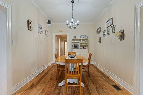 Step into the front of this home into a large sitting room perfect for an office, a library or after dinner lounging or hosting. The sitting room flows into the beautiful formal dining room with high ceilings which helps it feel spacious and reminds you of the timeless allure of its area.
