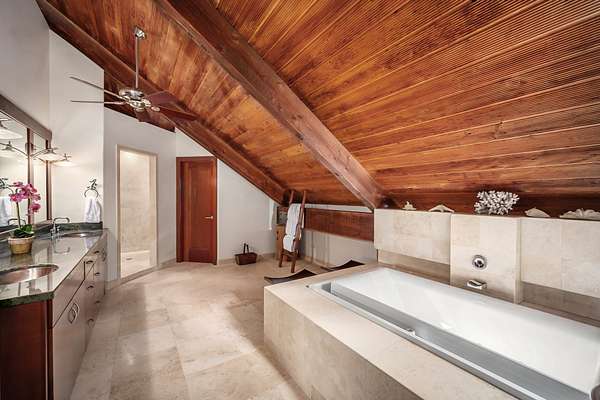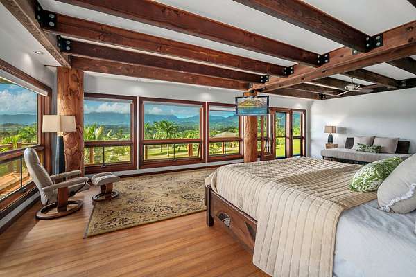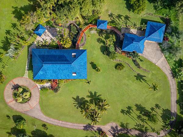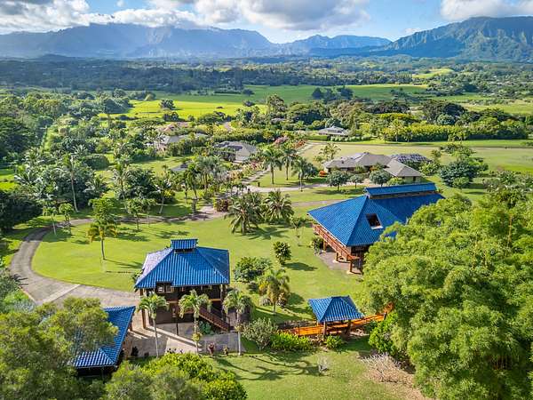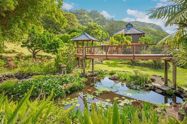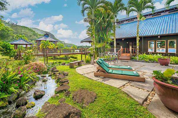 Nestled against the Nounou Forest Reserve, this exceptional 2.4-acre estate offers privacy, lush tropical landscaping, and stunning 180-degree views of Waialeale and the Makaleha Mountains. This custom home, with a striking blue tile roof, provides over 5,000 sq ft of living space across the main house and guest quarters. Expansive glass doors invite trade winds inside and frame breathtaking mountain views. Vaulted ceilings, wood floors, and oversized open-concept living and dining areas create an ideal space for entertaining. The gourmet kitchen is equipped with Bosch appliances, a gas cooktop, stone countertops, a large island, and a breakfast nook overlooking the gardens. Just off the kitchen is the heart of the property-a beautiful garden patio with a built-in Mugnaini wood-fired pizza oven overlooking a waterfall, a landscaped koi pond, and a bird habitat, creating a serene sanctuary that enhances everyday living. Each bedroom suite is generously sized with ensuite bathrooms featuring soaking tubs, oversized showers, and walk-in closets. The primary suite on the main floor offers single-level living with a large sitting area and expansive mountain views. Upstairs, the second primary suite opens to two private lanais and includes a connecting loft-perfect for a sitting area, flex space, or extra bedroom. The guest quarters, accessed via a 112-foot Ipe bridge through a pagoda overlooking the gardens, sits above an enclosed two-car garage. It offers ample space, a kitchenette, private bath, and stunning views. An additional detached accessory building provides flexible workspace or extra garage space. The property includes mature orange, key lime, mango, banana, avocado, star fruit, lemon, citron, papaya, dragon fruit, macadamia nut, and coffee trees - a gardener's dream.Hiking enthusiasts will appreciate the proximity to the Sleeping Giant trailhead and centrally located with easy access to Kauai's North and South Shore.