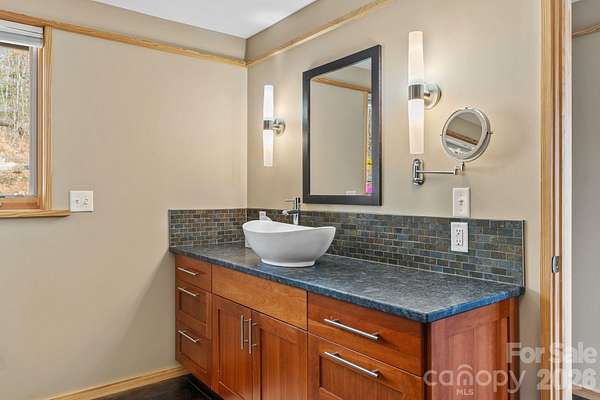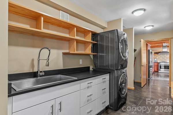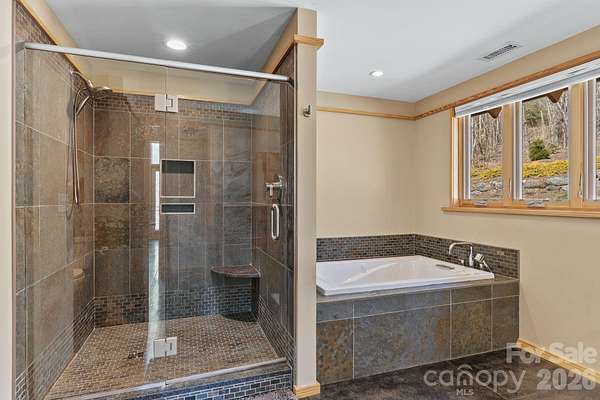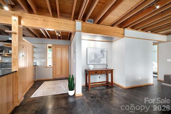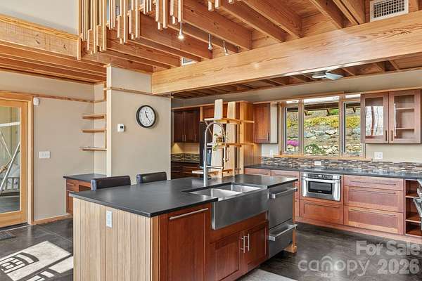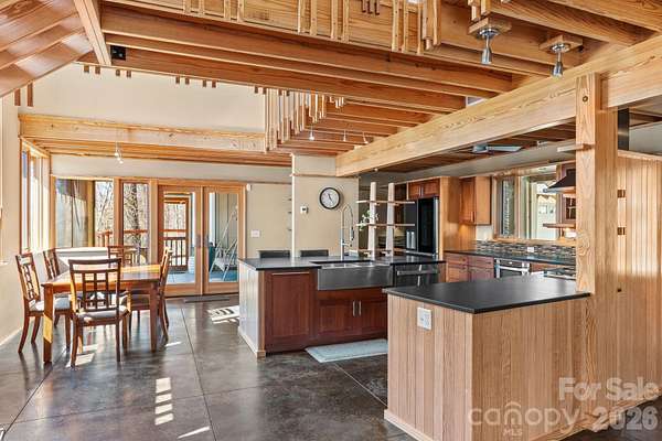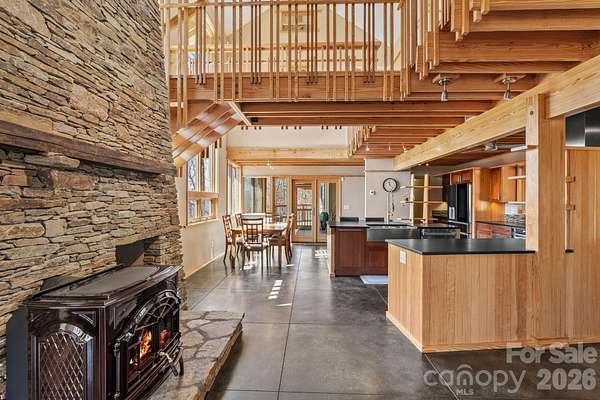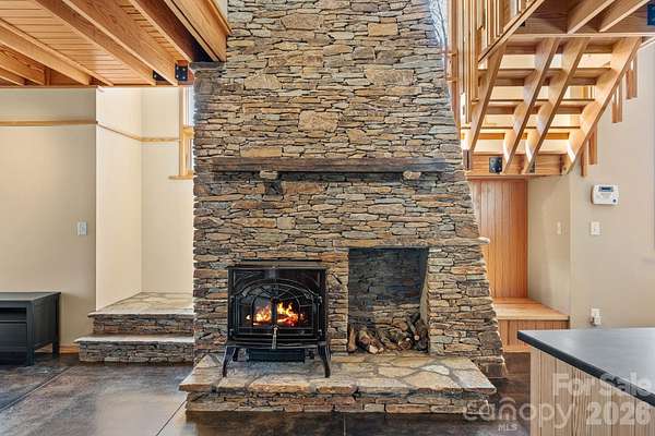 Perched atop 33+ private acres in Swannanoa's beautiful Bee Tree area, this custom home designed by award-winning architect Chris Larson, is thoughtfully positioned to capture long-range mountain views that stretch beyond the trees. Delivering a striking blend of craftsmanship, warmth, and intentional design, a dramatic two-story stone fireplace anchors the open-concept living space, framed by exposed timber beams, radiant-heated concrete floors, and expansive windows that flood the home with natural light. The chef's kitchen is equal parts functional and beautiful, featuring high-end appliances, custom cabinetry, and a generous island, seamlessly connecting the indoor and outdoor living areas. The main-level primary suite provides a peaceful retreat with a spa-like bath and direct access to the outdoors. Upstairs, two additional bedrooms and a versatile loft/bonus space offer flexibility for family, guests, or work. Outdoor living is where this property quietly shows off, with over 2,000SF of decks and patios, a screened porch, fenced yard, outdoor shower, and a private trail system winding through your own personal acreage. Additional highlights include an oversized two-car garage, tons of walk-in attic storage, and a highly functional mud/laundry area. This one-of-a-kind property offers a private setting that feels worlds away while still within easy reach of Asheville. Please no drive-bys...contact your agent for a showing today!
