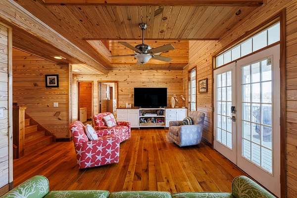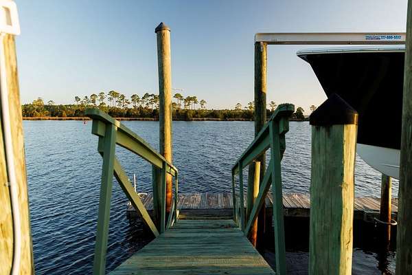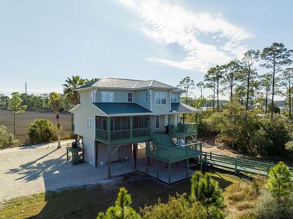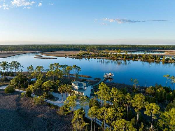 Deep water Gulf access estate offering over 240 feet of Carrabelle River frontage on more than 9 private acres. This exceptional custom built home combines waterfront living, privacy, and convenience with downtown Carrabelle just minutes away and county taxes. The property features a private boat dock with both stationary and floating platforms, perfect for boating, fishing, and enjoying the beautiful river setting. The home offers 3 bedrooms and 3.5 baths with a thoughtful floor plan designed to capture the stunning river views. The primary suite is located on the first floor, while two ensuite bedrooms and a second floor studio or bonus room overlooking the river provide excellent space for guests or additional living areas. Expansive covered and open decking creates the perfect setting for outdoor entertaining and relaxing while taking in the water views. Inside, the home showcases beautiful custom finishes including cedar walls and ceilings, oak plank flooring, exposed pine and oak beams, custom yellow pine interior doors, and rich cherry and black walnut trim throughout. The exterior features low maintenance vinyl siding and a durable standing seam metal roof. This rare waterfront property offers the perfect blend of craftsmanship, privacy, and deep water access to the Gulf.