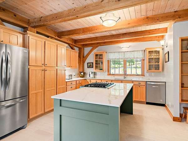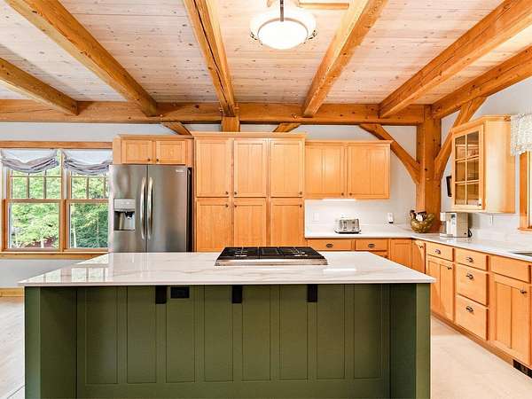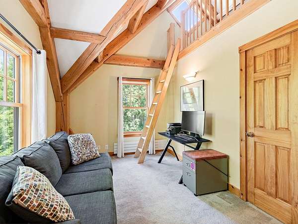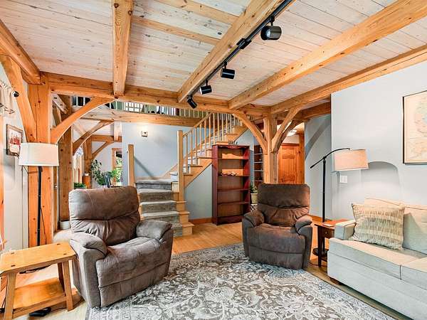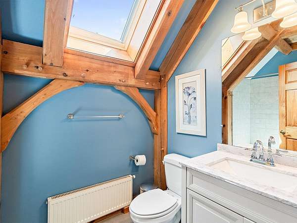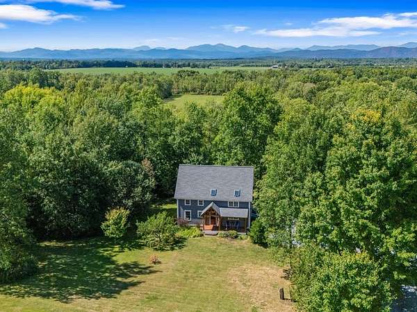 On Round Barn Road, this distinctive post-and-beam home sits on 2.1 acres, combining rural beauty with a location that keeps you connected to nearby towns and amenities. From the moment you step inside, you're welcomed by soaring vaulted ceilings and an abundance of character that sets this home apart! Enjoy many thoughtful updates including the recently renovated kitchen, addition of a rear deck, and roof replacement (2020). The living room flows naturally to a tranquil back deck, complete with an included solar shade - ideal for relaxing outdoors. A home office and a convenient half bathroom round out the first floor. Upstairs, the primary suite impresses with a grand vaulted ceiling, storage loft above, and two custom reach-in closets. The luxurious en suite bathroom features an air jetted soaking tub and step-in shower, creating a private retreat. The second floor also offers another comfortable bedroom, full bathroom, and den that is the third bedroom. A unique loft area, accessed by ladder, adds a playful architectural touch, while VELUX motorized shades allow you to easily adjust the natural light from the skylights. Outside, the front yard boasts a fruit-bearing peach tree, mature landscaping, and established perennials framed by natural shade. The large backyard provides even more room to enjoy the outdoors! Conveniently located between Shelburne, Vergennes, and nearby state parks!